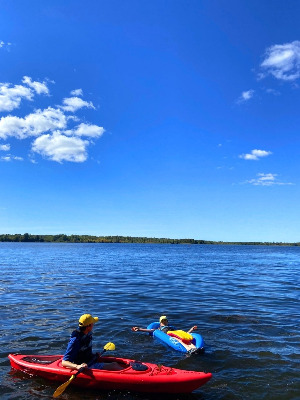 호수에서 수영하고 카누를 탄다.