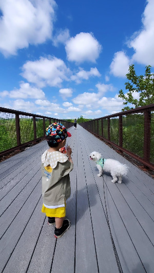 은지는 밍키와 근처 숲길을 걷는다.