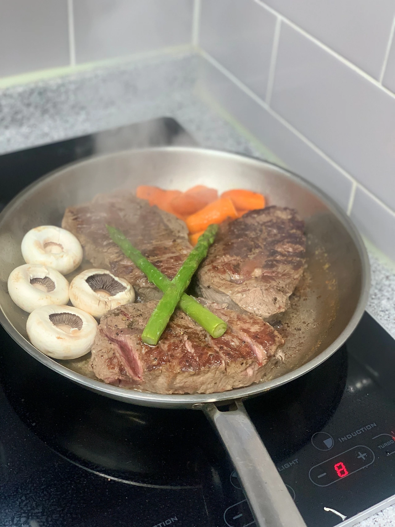 스텐 팬의 잘 쓰는 요령 중 하나는 한쪽면이 70% 익어 갈 때 뒤집어 주는 게 팁이다.