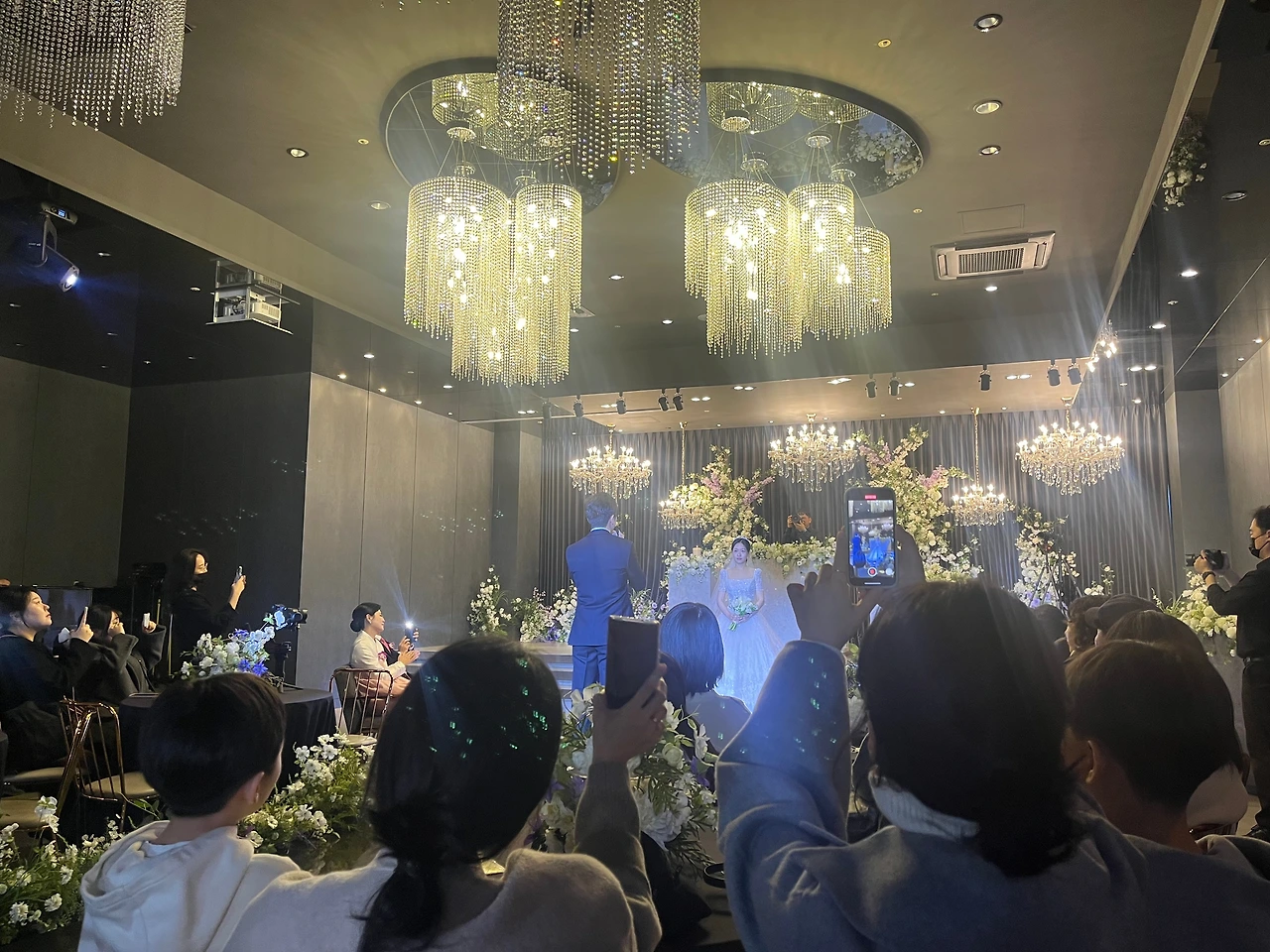 앞에 있는 결혼식 진행자 요청에 하객들은 라이트를 켠 폰을 위로 들어 노래에 맞춰 흔들어 줬다.