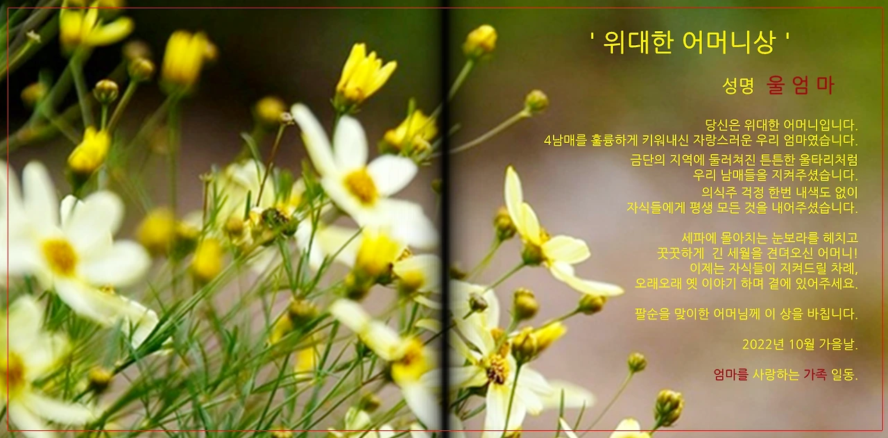 모든 어머니의 비슷한 소원 이야기일 것이다. 자식의 행복에 부모가 미소 짓듯이 엄마가 행복해져야 자식들이 더 행복해질 것이다. 자식을 먼저 생각하는 위대한 어머니들 건강하게 장수하시기를 기원하며 울 엄마에게 드리는 글로 감사의 마음을 대신한다.