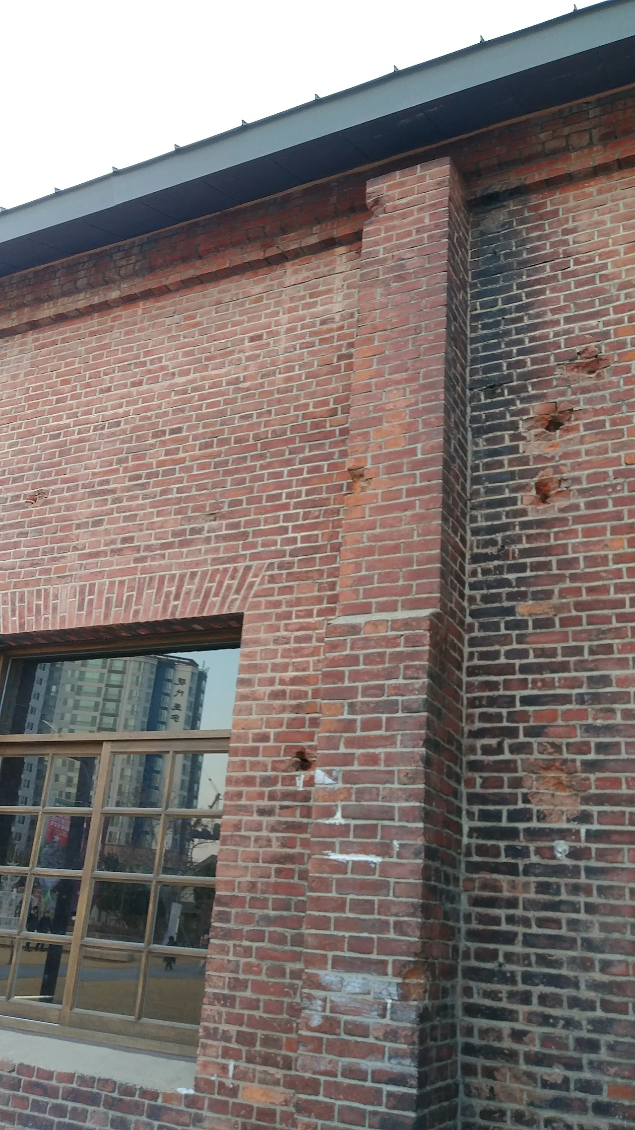 한국전쟁 당시 역사는 소실되었지만 정비고는 부서지지 않았던가 봐요. 그 당시 총알 자국입니다. 6.25의 흔적이 벽에 고스란히 남았습니다.