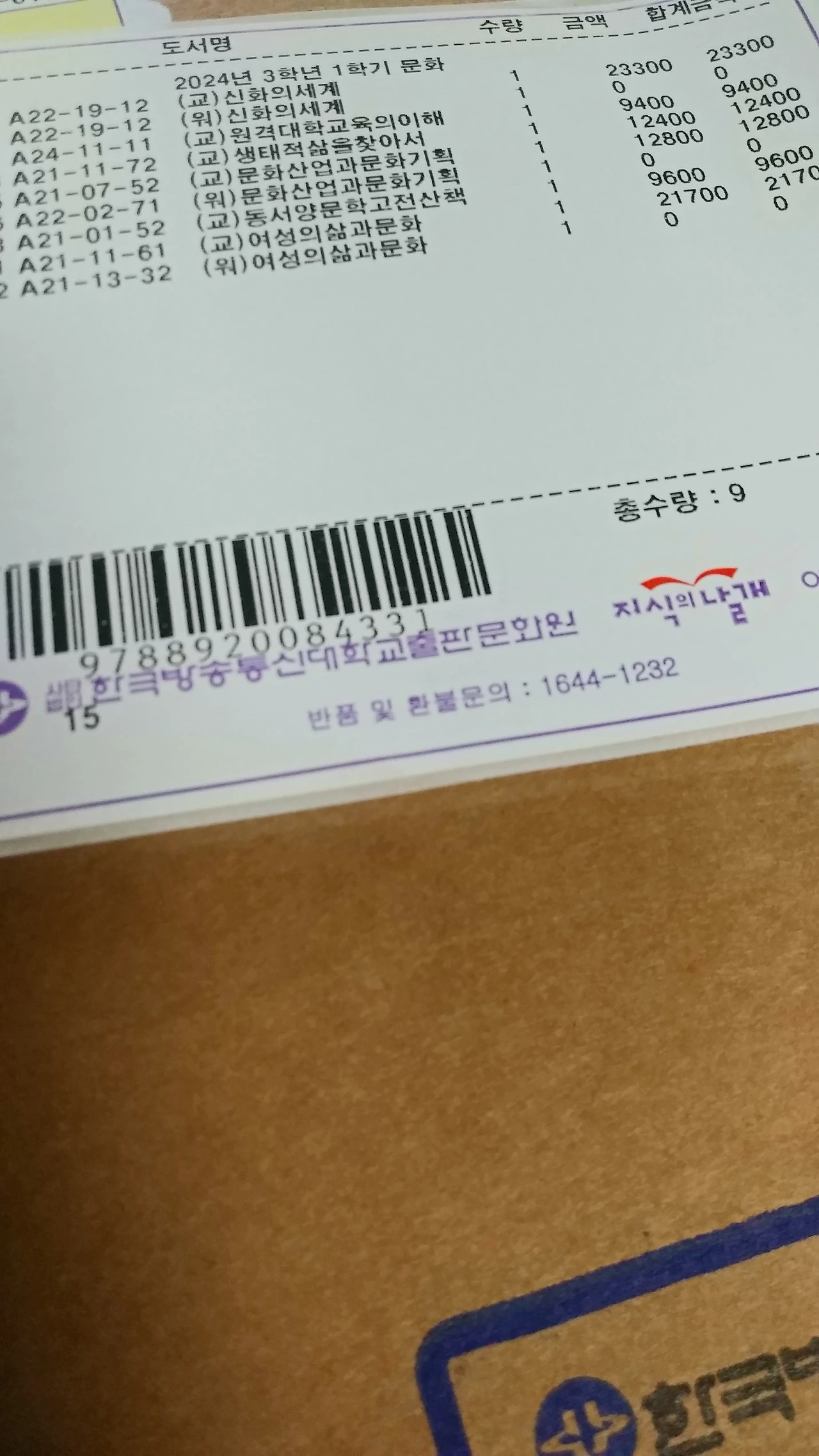 방통대에서 택배가 왔다. 방통대가 아니라 방통대 출판사라고 해야 하나? 한 학기 책이 담긴 9만 원 정도 값을 낸 물건. 말은 똑바로 해야지. 89,200원어치다. 학비랑 한 학기 교재비까지 다해서 40만 원 정도. 여전히 방통대는 싸다. 싸면 다이소 다이소는.. 그만해라.