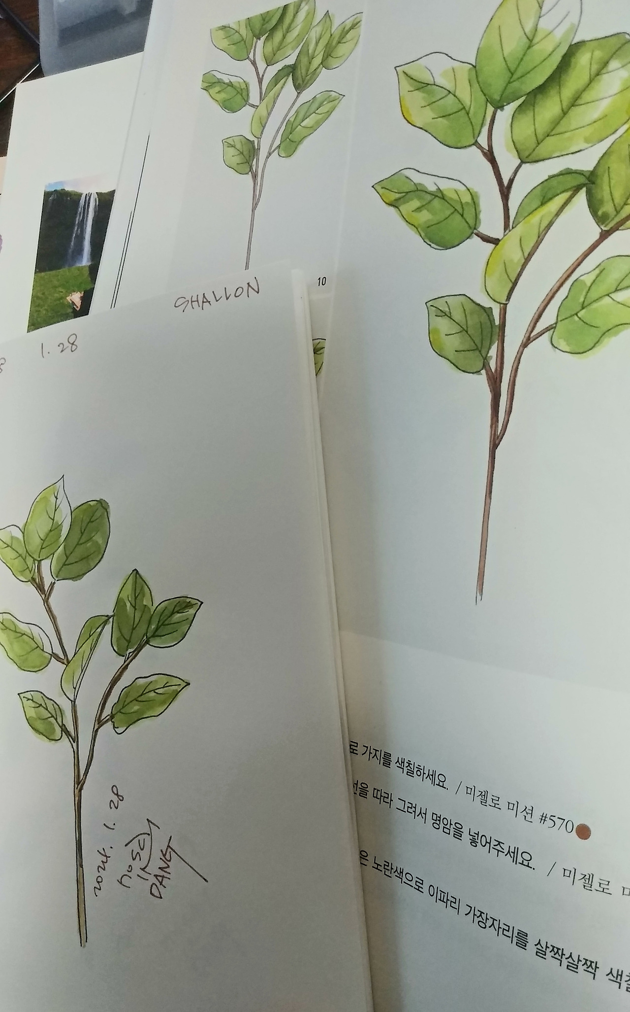 이 책의 특징은 수채와 마카 그리고 색연필을 맛보기로 연습해 볼 수 있다는 걸 거예요. 저는 마카 부분도 색연필 부분도 다 수채로 처리했습니다. 수채가 급하기 때문에... 이번 책은 좀 빨리 끝내기 위해서 11일 치 한 번에 올립니다. 가볍게 스쳐 보시죠^^