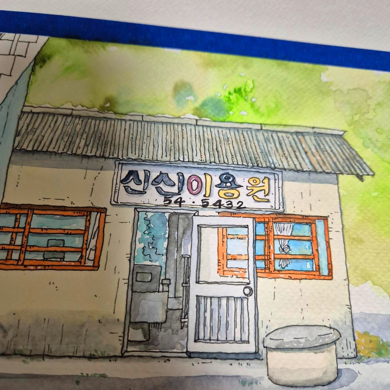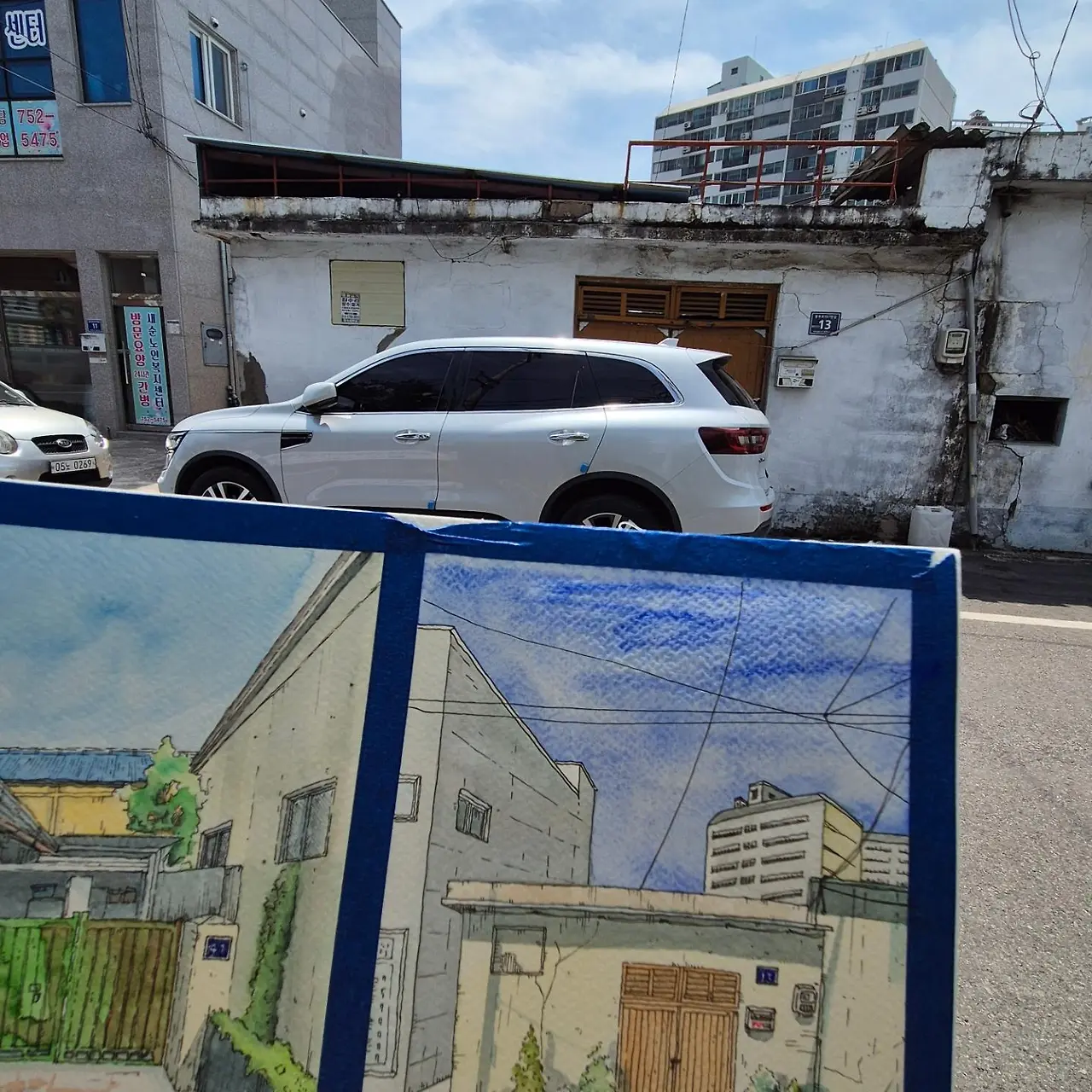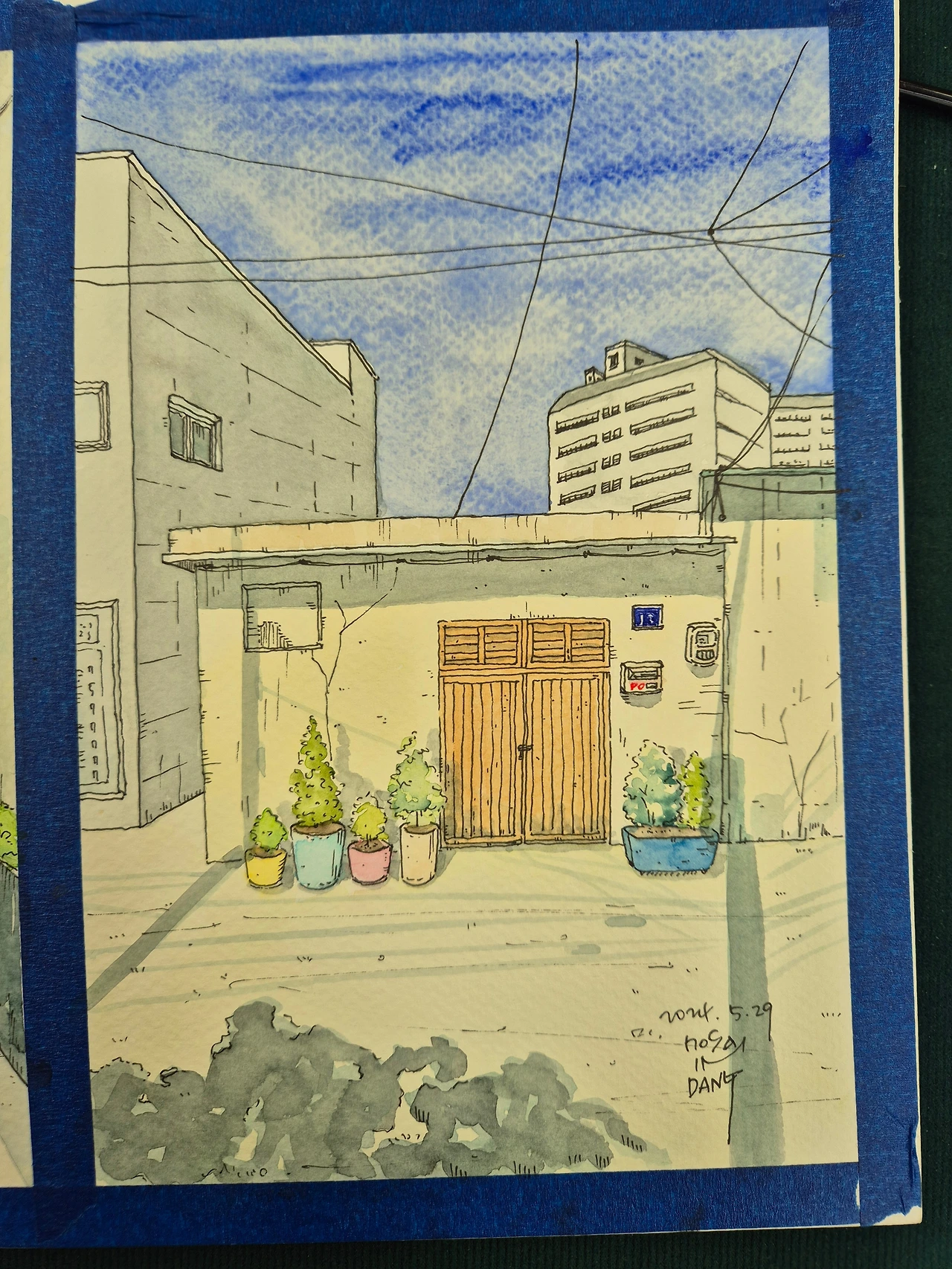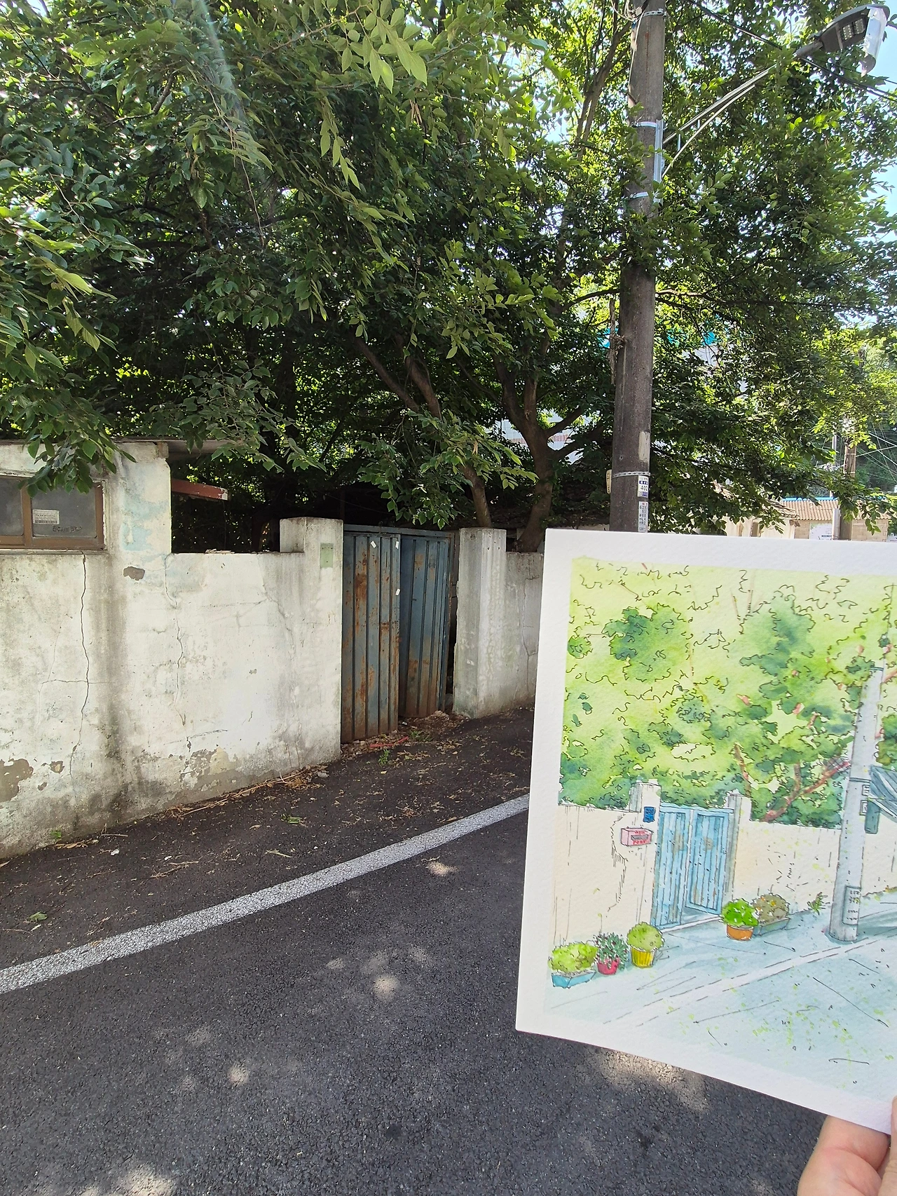 연재하면서 하던 건? 그건 남들이 어반스케치 해 놓은 거 따라 그린 거. 컬러링급 그림이었고요. 제가 발로 뛰며(?) 다닌 길에 눈을 사로잡는 피사체를 찍고, 집이든 꽃이든 인상적이었던 그것을 그리고 있답니다. 어떻게 그려질지는 예상할 수 없지만(워낙 버라이어티한 실력이라) 사진을 찍는 그 순간은 '빨리 그리고 싶다', '그려놓으면 정말 이쁘겠다', '어떻게 나올까?' 상상하며 찍는데요. 그 시간이 그리는 시간만큼 혹은 더 많이 행복하답니다. 좋아하는 집 구경, 골목 구경이 주는 생동감 신선함도 한몫한 거 같긴 하네요.