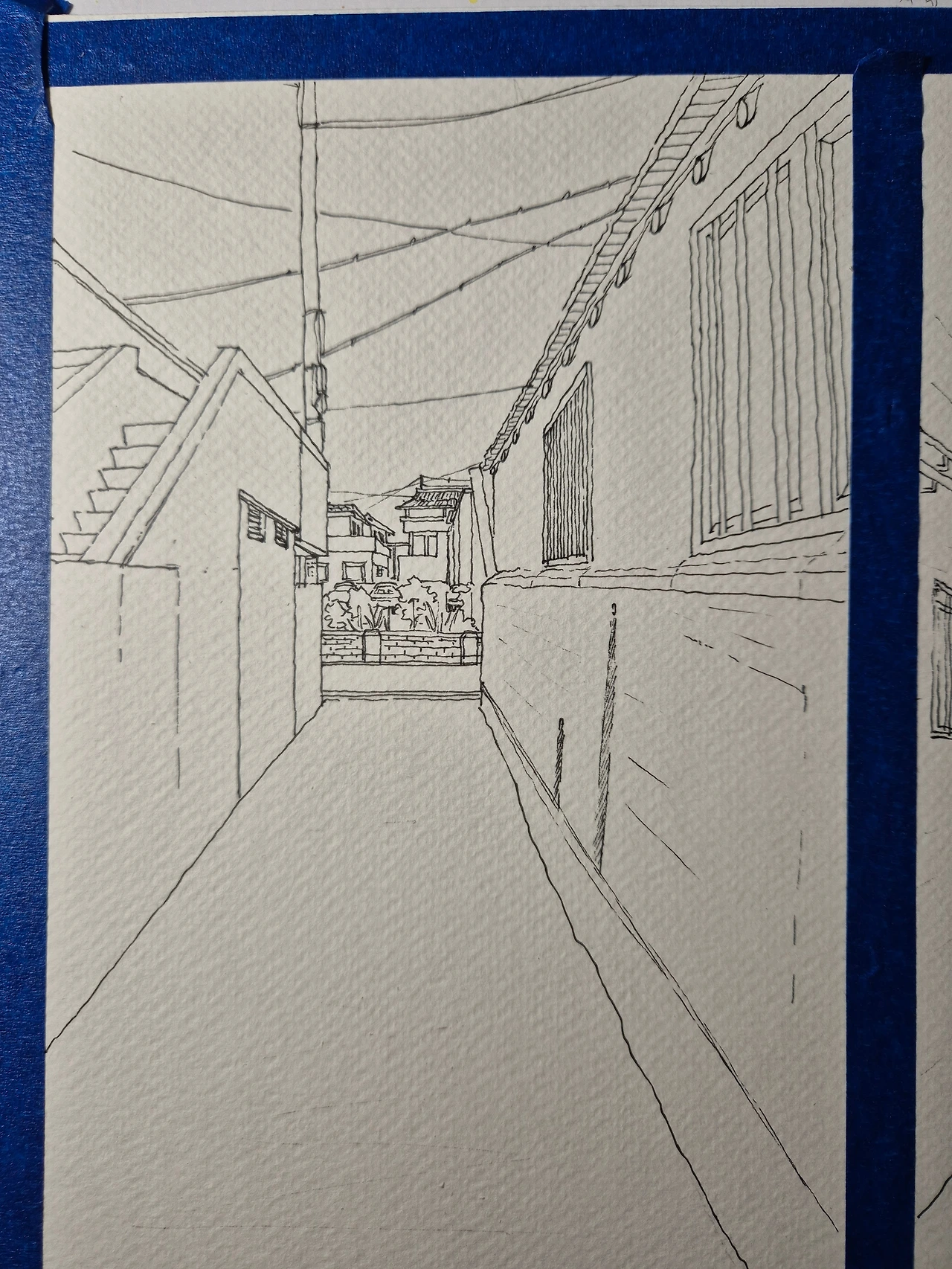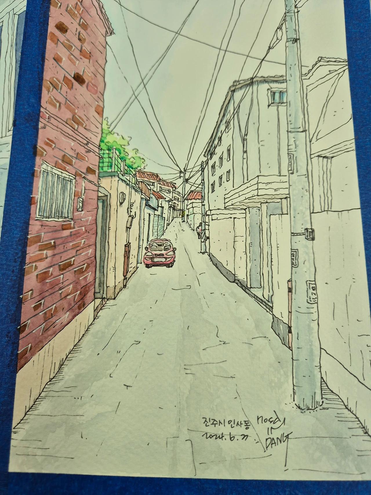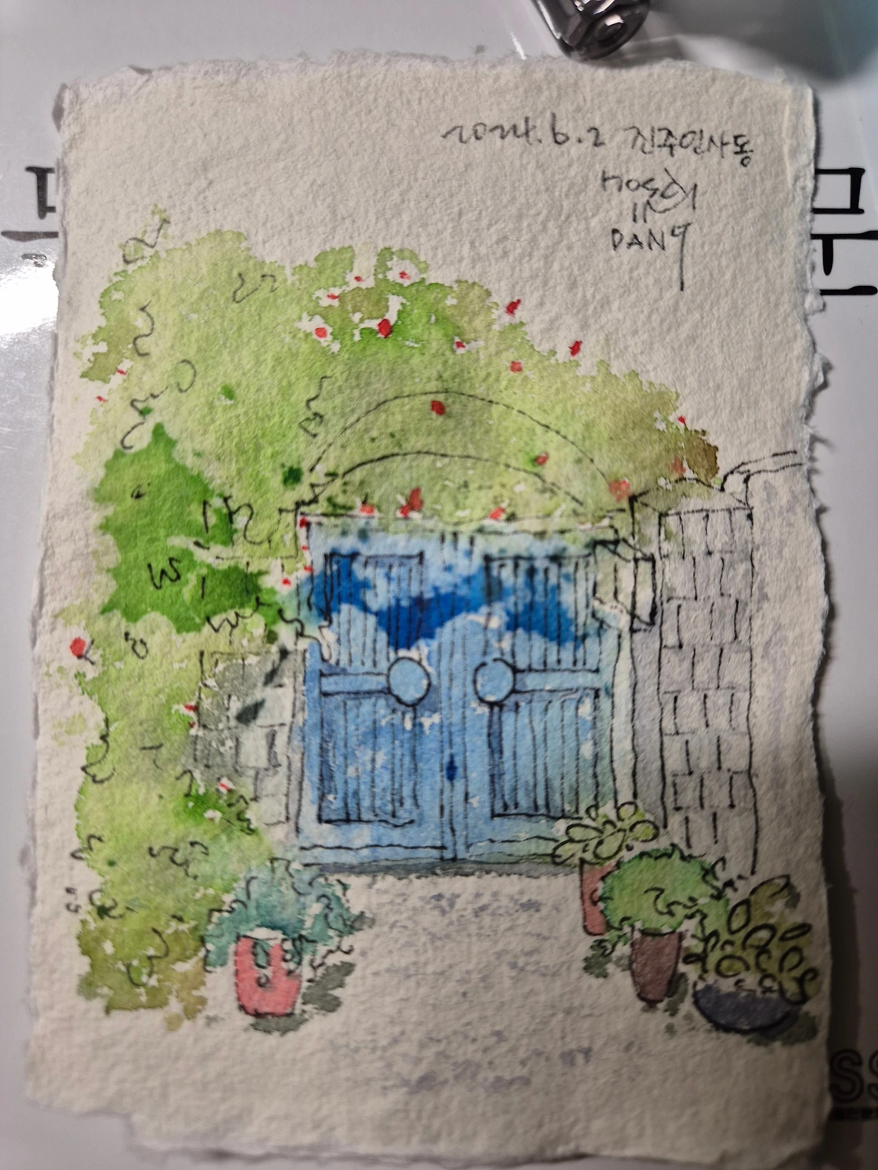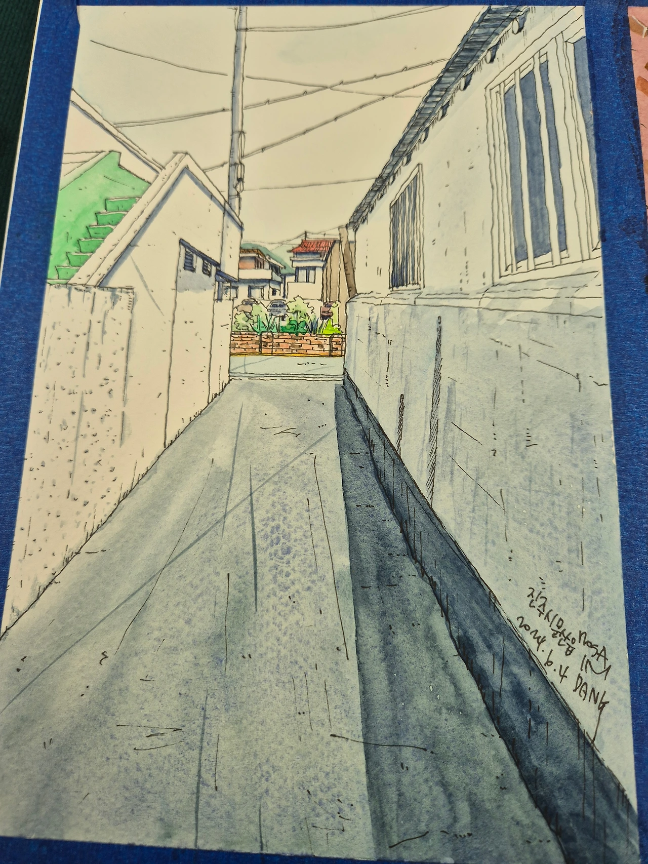 종이라는 공간으로 옮겨 넣는 것에 조금은 익숙해진 건지 모르겠습니다. 그림은 언제나 잘하고 싶은 '무엇'이어서 항상 부담으로 작용했는데 조금은 잘하게 되어서일까요. 아니면 매일 하다 보니 익숙해져 생각이 떠오르기 전에 손이 먼저 움직여서인지도 모르겠습니다. 습관처럼요. 펜으로 주변을 종이 위로 옮겨 놓듯, 오늘 본 화사하고 이쁜 하늘과 골목 색들도 수채화 종이에 옮겨놓을 날이 언젠간 오겠지요? 그날이 사실 빨리 오면 좋겠습니다. (큰딸은 제 그림의 관객이 되어주는데 제 초록이 이쁘다고 하네요. 건물 선이랑요. 선은 끄덕이겠는데 색이 이쁘다니 잘하라고 하는 소린가.. 싶긴 합니다^^)
