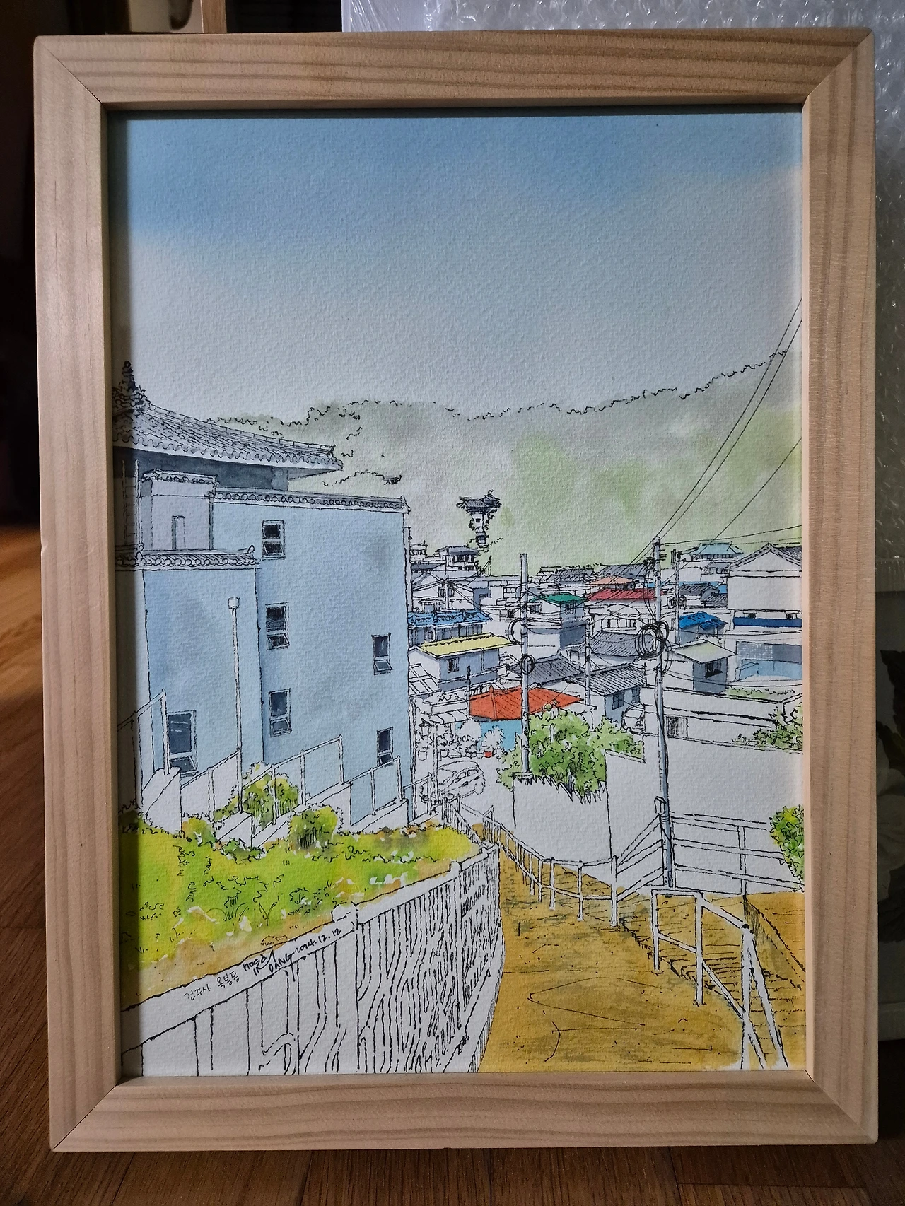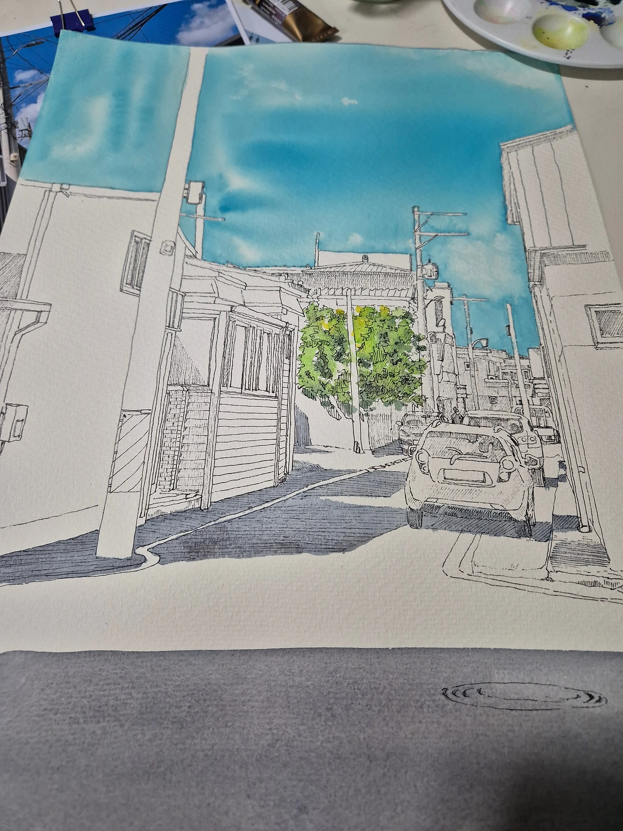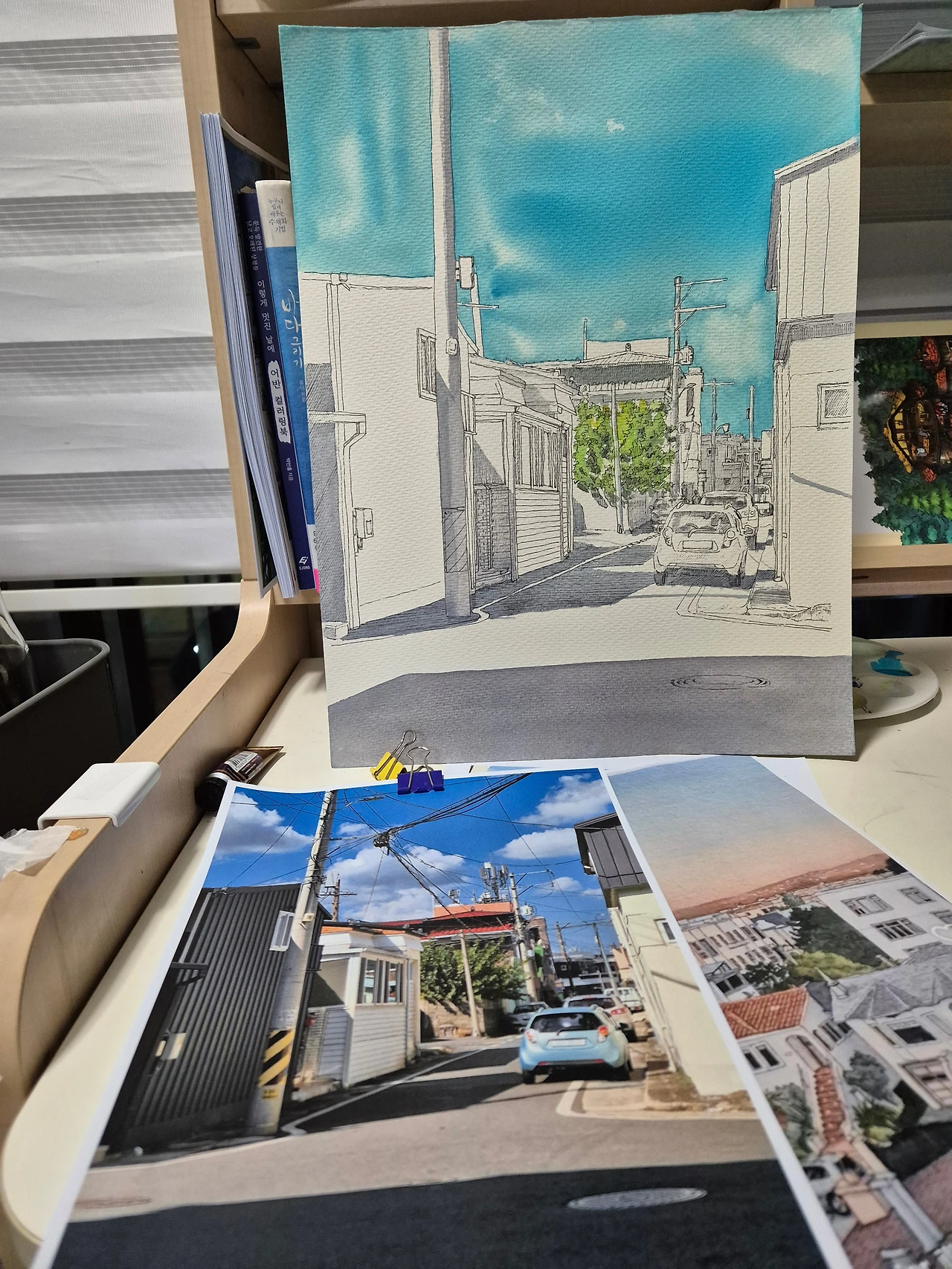 어반스케치의 화룡점정. 전깃줄을 안 그렸다. 이것도 내일의 숙제로 패스~~