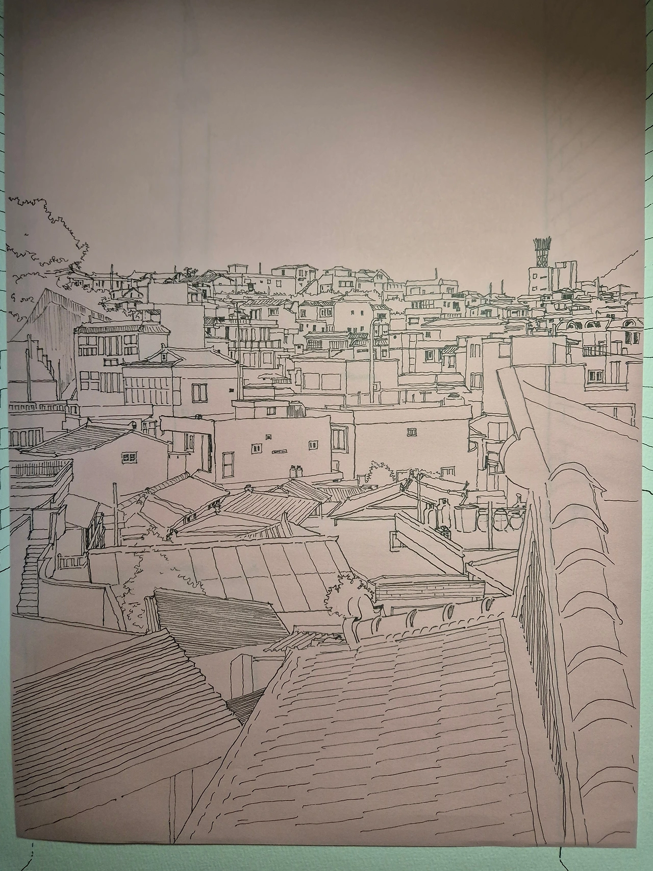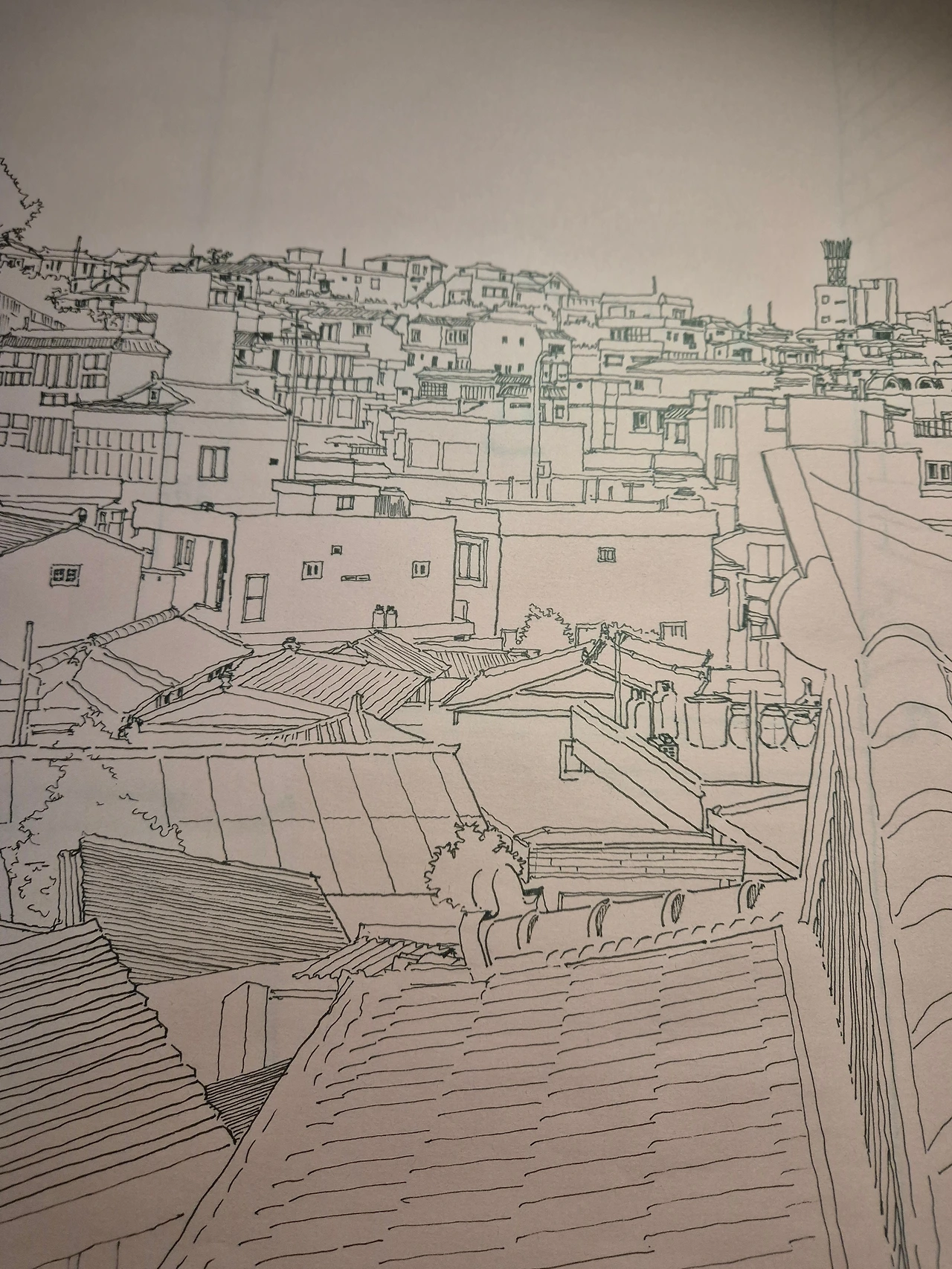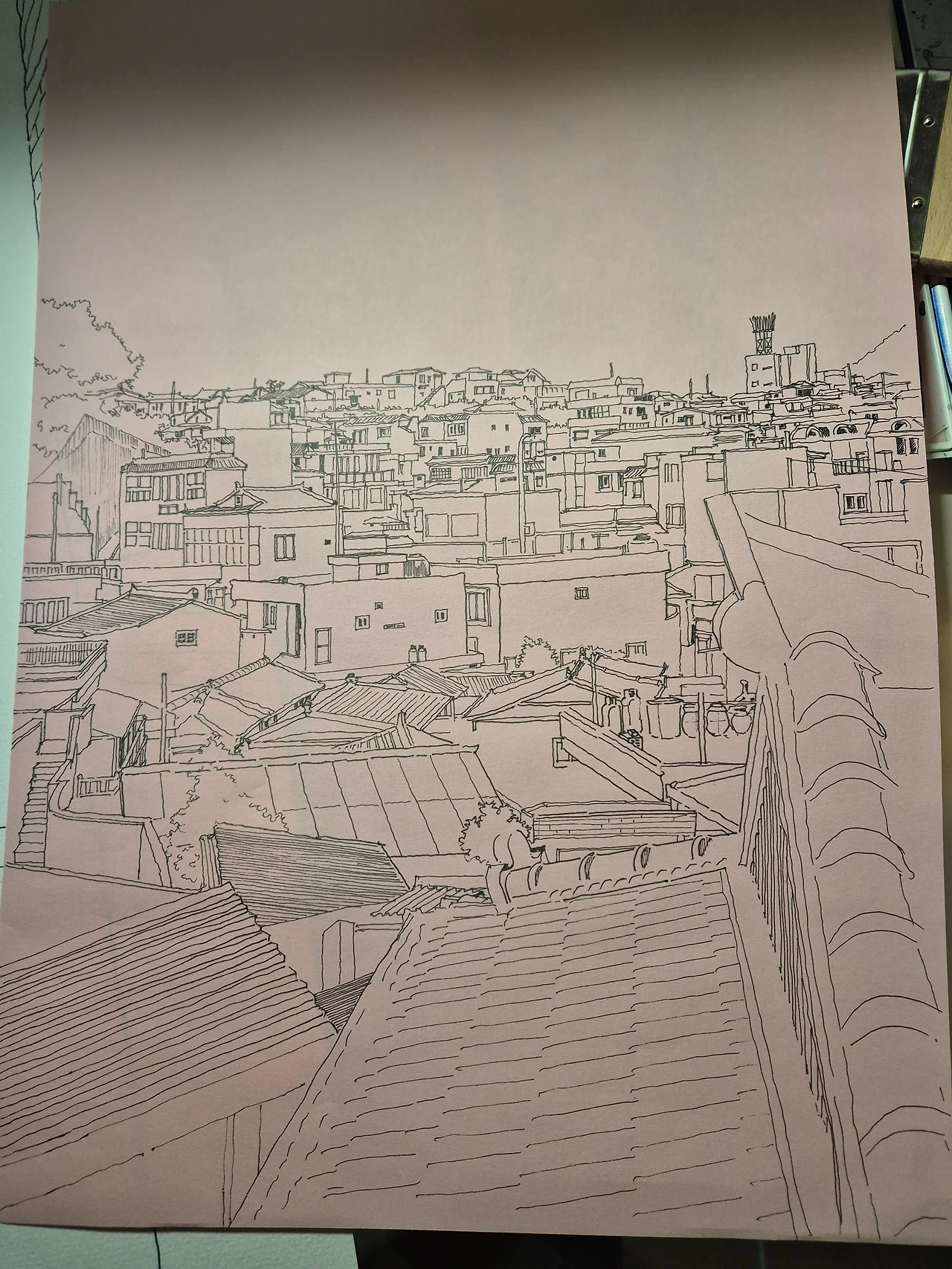 수채화지를 샀는데 내지 보호종이가 너무 아까운 거예요. (못 버리는 사람 특징이랄까..) 안 버리고 뭘 그려봤는데요. 얇아요. 색연필 그림으로 마무리해야겠어요. 물감 바르면 종이 찢어질 거 같아요. 진주에서 좋아하는 동네 중 하나인 옥봉동. 언덕도 산도 보이지 않게 집이 정상을 차지한 동네입니다. 며칠 전에 찍은 사진 그려봤습니다. 풍성하던 나무가 졸가리만 남은 상태입니다. 좀 풍성하게 색칠은 해 주려고요. 탄핵도 마무리되어 미친 대통령도 없고 어제의 안타까운 죽음이 억울하지 않게 규명된 후 여름을 맞을 내년 여름 어느 날을 상상하면서요. 얇으니 펜선은 잘 살아서 그리기 편했습니다.