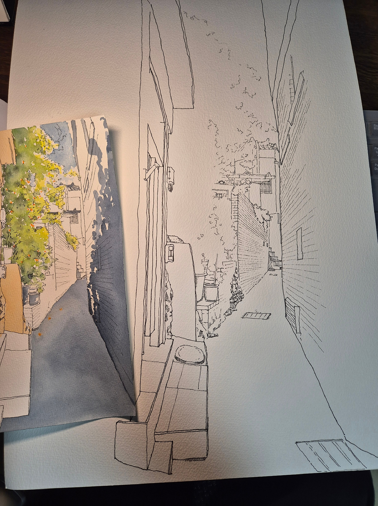 (왼) 지인 상가에서 내려다본 아랫동네와 (오) 그 근처 동네. 색칠하려다가 미완성.