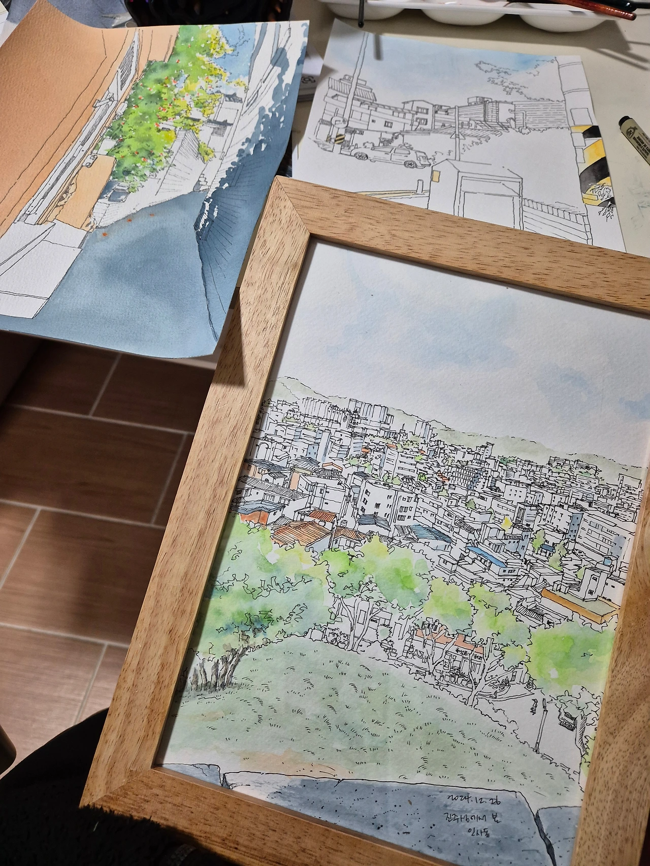 진주성에서 본 인사동 색칠을 어디까지 할지 고민하다 한 것도 아니고 안 한 것도 아닌 상태로 모르겠다 끝내자~ 며 액자에 일단 담았습니다. 오늘 일단 조금씩 세 장 색칠 넣었습니다. 물론 미완성.