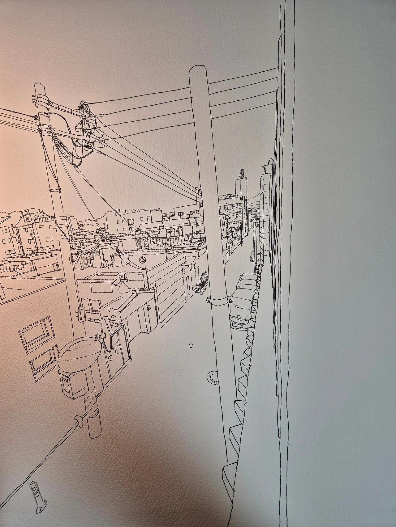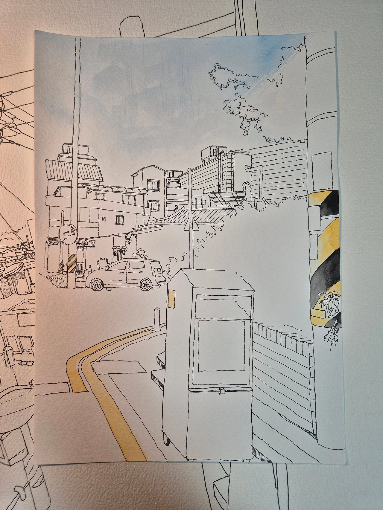 오늘은 지인 상가 동네 사진이다. 골목이 마음에 들어 찍어 놓았다. 약간의 비탈에 지어진 곳이라 주차장에서 내려다본 외부는 2층높이정도 아래에 있다. 진주에서 흔하지 않은 언덕에 위치해 있다. 내려다보긴 했지만 쭉 뻗은 길이 보이니 오르막처럼 느껴지지도 않는다. 오래된 듯 오래되지 않은 길이다. 좋아하는 개량한옥도 없고 슬레이트도 없지만 동네가 주는 느낌은 익숙하다. 20년 이상은 이 상태 그대로 있었을 것 같다. 전봇대도 빨래도 가지런히 줄 서 있는 동네. 오늘은 이 동네로 정했다. 그림으로 떠나는 동네 산책이다.