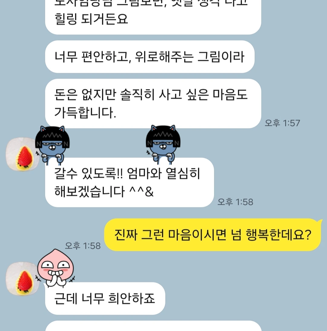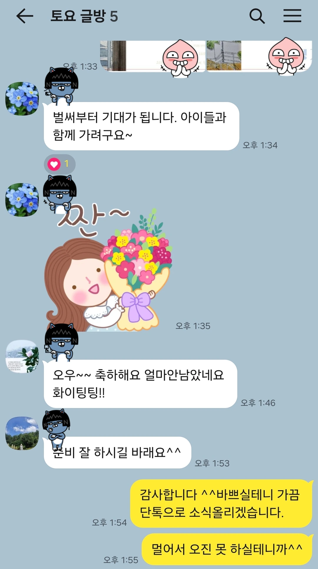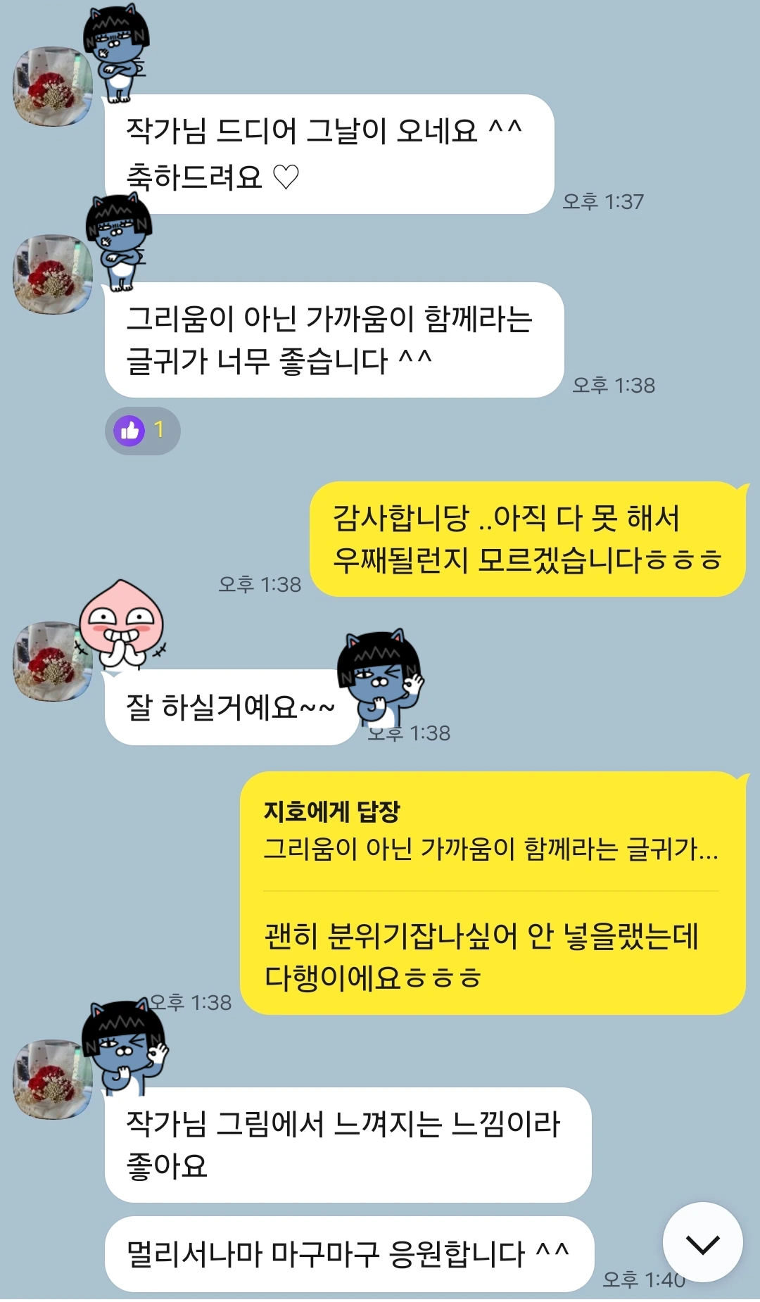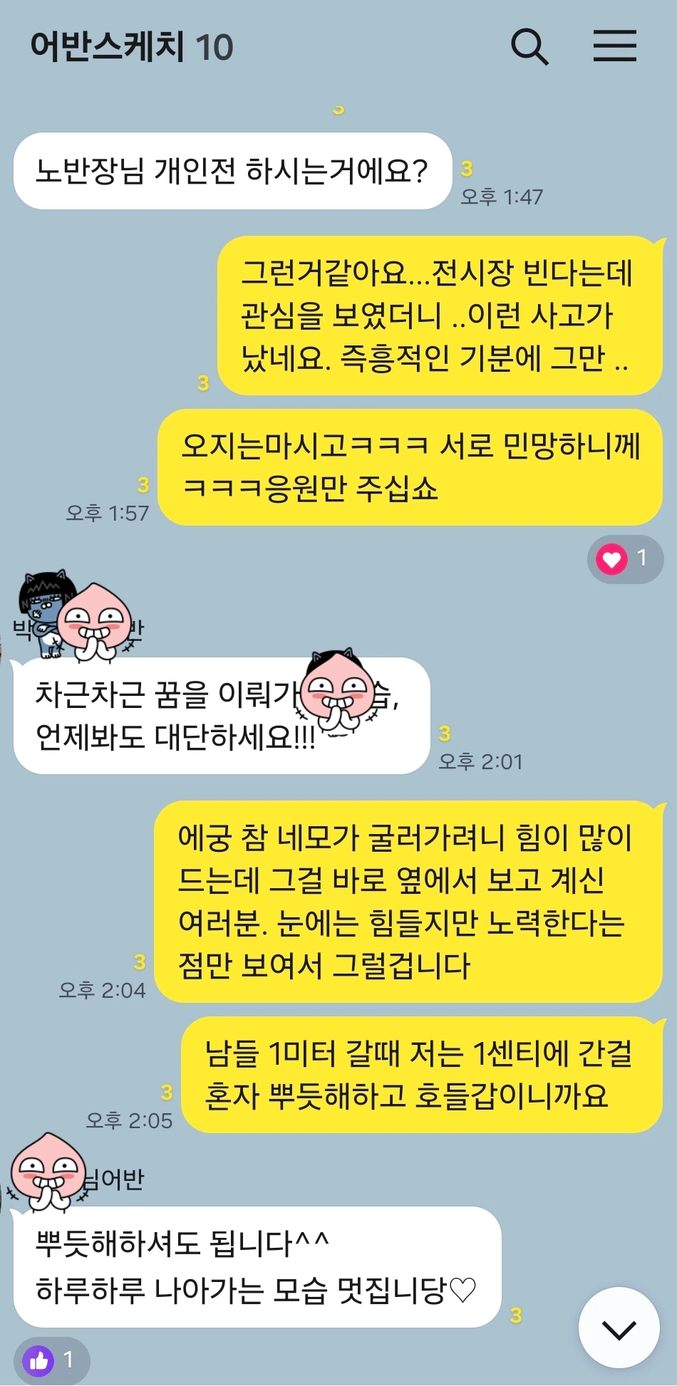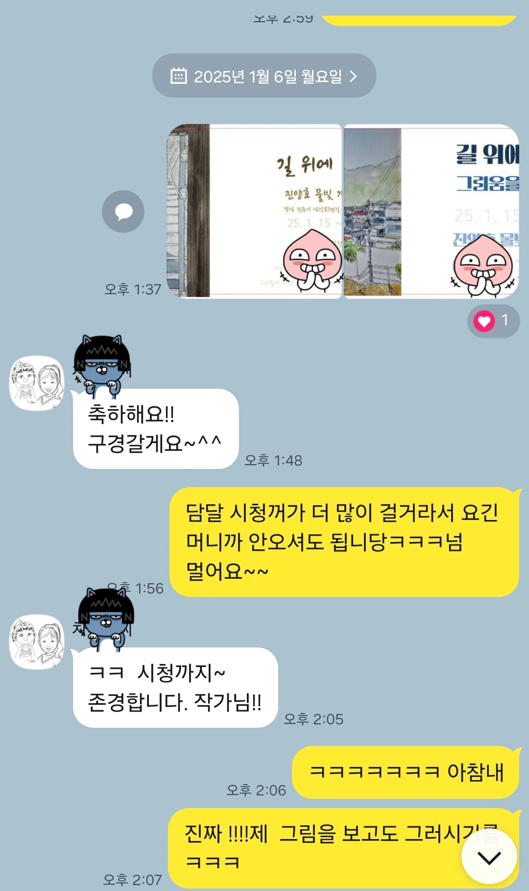 왼)서울 사는 라라크루 동지깨서 응원 보내주셨습니다. 감사합니다. 오)어반스케치 동아리에는 알리지 말까...고민하다가.ㅋㅋㅋㅋ부끄러워서리..제 실력을 다 아는분께 이런 소식을.. 5군데 카톡방에 남긴 단체 대화 캡처(허락같은거 받지 않음ㅋㅋㅋ)