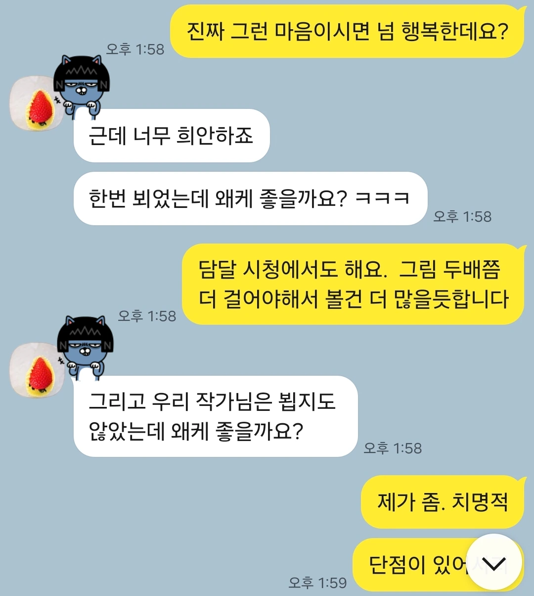 너무 채색에 스트레스받는 거 같아서요. 좋아하는 외국 작가 흉내를 내면서 선도 색도 대충한 거 같은 그림 그려보았습니다. 채색까지 한 시간 만에 끝~(약간 힘 빼고 그린 거 같아서 편안해 보이는 장 자크 상폐 작가 느낌으로다가...사실은 엄청난 내공이 있어서 편안해 보이는 건데 제 눈에는 대충해서 간단해 보이는 그런 그림 말이죠) 어쨌든 결과적으로 힘을 빼니 즐겁네요. 너무 잘하려고 힘을 주니 어깨도 손가락도 아팠는데 재미있게 끝냈습니다. 성의 없는 그림이라 반응이 전혀 예상이 안 되지만 즐겁게 할 수 있어 오늘 내일은 스트레스 해소용으로 이런 그림을 그릴 것 같습니다.