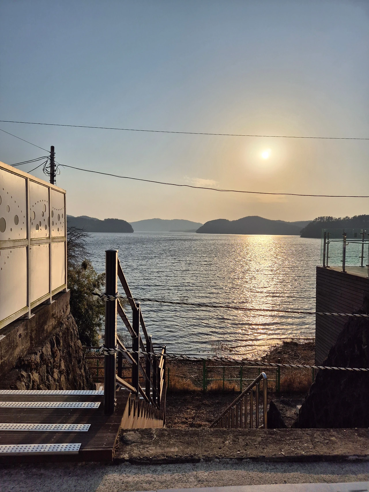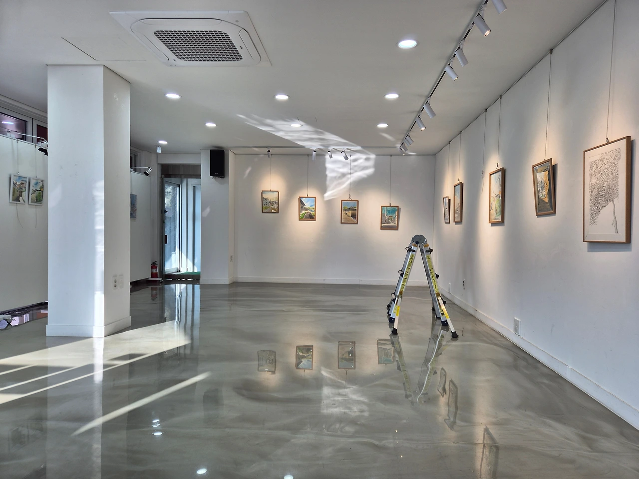 그림을 몇 개나 걸어야 할지 몰라 사전 답사를 갔을 때는 몰랐다. 예전에 진양호 선착장이 있던 곳이란다. 택시 기사님께 갤러리로 가 달라 말씀을 드렸을 때는 어딘지 모른다더니 도착해 가니 "예전 선착장이네요" 하셨다. 예전에는 오리배도 띄우고 호수도 한 바퀴 도는 유람선이 있었단다. 호수가 크긴 큰데 유람선까지 있었다니 상상이 잘 가진 않는다. 이곳의 해가, 이곳의 물이 주는 남다름 때문에 아마 신선놀음하는 배 같아 보였을 것 같다. 그 얘기를 듣고 내려보니 이곳저곳 새롭게 보였다.