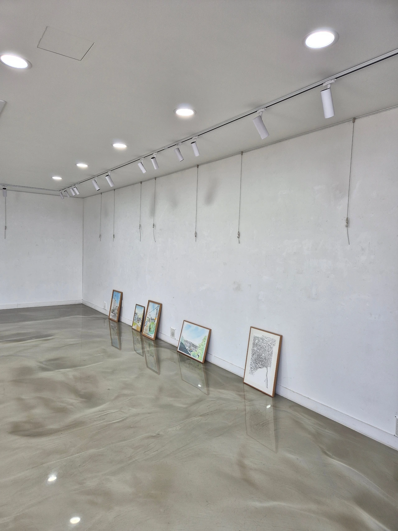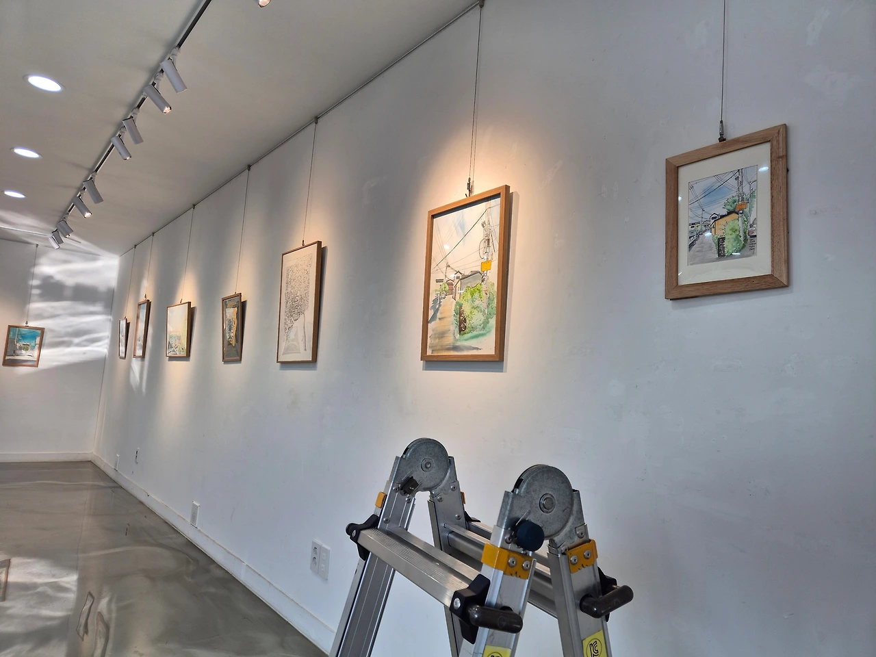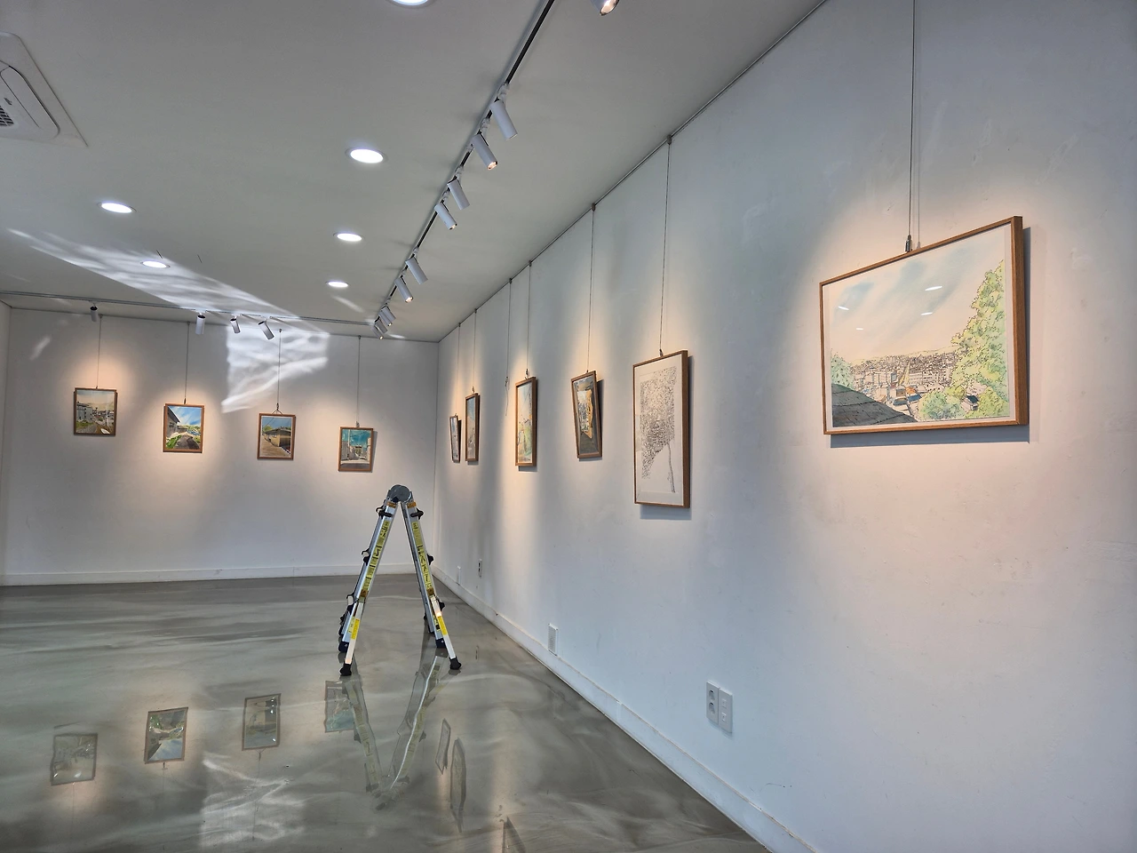 그림 옆에 붙일 안내 문구는 다 썼는데 어떤 방법으로 붙일지 결정은 못 한 채 오늘을 맞았었다. 도톰한 수채화지에 출력한 A4 지를 붙여서도 해보고 캘리그래피로 써보려 시도도 했지만 허접함이 뚝뚝 흘렀다. 작품을 돋보이게 하기는커녕 물귀신처럼 전시 분위기를 흐려 놓을 품새였다. 이럴 땐 커닝이 답이지. 검색창에서 둘러보니 이런저런 방법은 다양했지만 가장 문안하고 대중적인 건 폼보드였다. 폼보드에 안내할 내용을 붙여 양면테이프로. 좋았어. 그렇게 정오를 10분 여분 넘기고도 오리고 붙이고 자르고 하느라 시간도 빠듯했다.