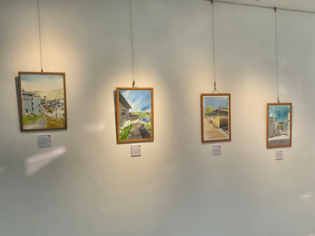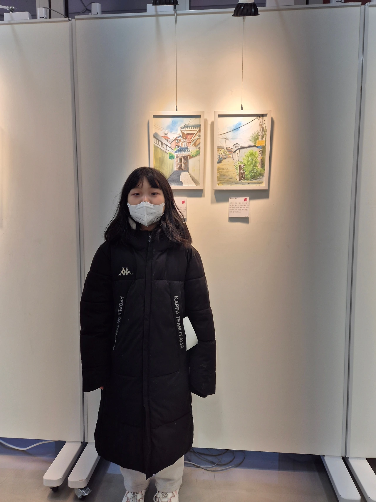 전시관에 작은 딸과 들어가 어제 깜빡한 그림도 걸고 안내지도 마저 걸었다. 안내하는 분이 따로 있다 보니 앉을 자리도 없고 공간이 어색해 쭈뼛쭈뼛 돌아다니며 그새 팔랑거리며 벌어진 안내 종이에 양면테이프도 붙이고 그림도 더 걸며 정리를 했다. 조금 있자 첫 손님 입장. 그림과 그 그림을 그리며 든 생각을 적은 안내지를 유심히 본다. 친구로 보이는 두 분이 얘기하는 소리에 쫑긋 귀가 세워졌다. 민망하게도 적어놓은 글을 읽으며 관람한다. 안내 문구를 읽으며 대화를 나누는 소리에 안내인이 깨알같이 설명하며 작가님이 옆에 있다 소개까지 한다. 뭘 소개까지…. 어색하게 인사를 하고는 '나가야 하나?' 생각한 준비 자세를 풀었다. 에피소드도 좀 풀고 재롱을 좀 떨어야 하나, 우아한 척 "아, 이 그림은 말이쬬!"대화를 이끌어야 하나 고민하는 새 1호 관람자분들이 나간다.