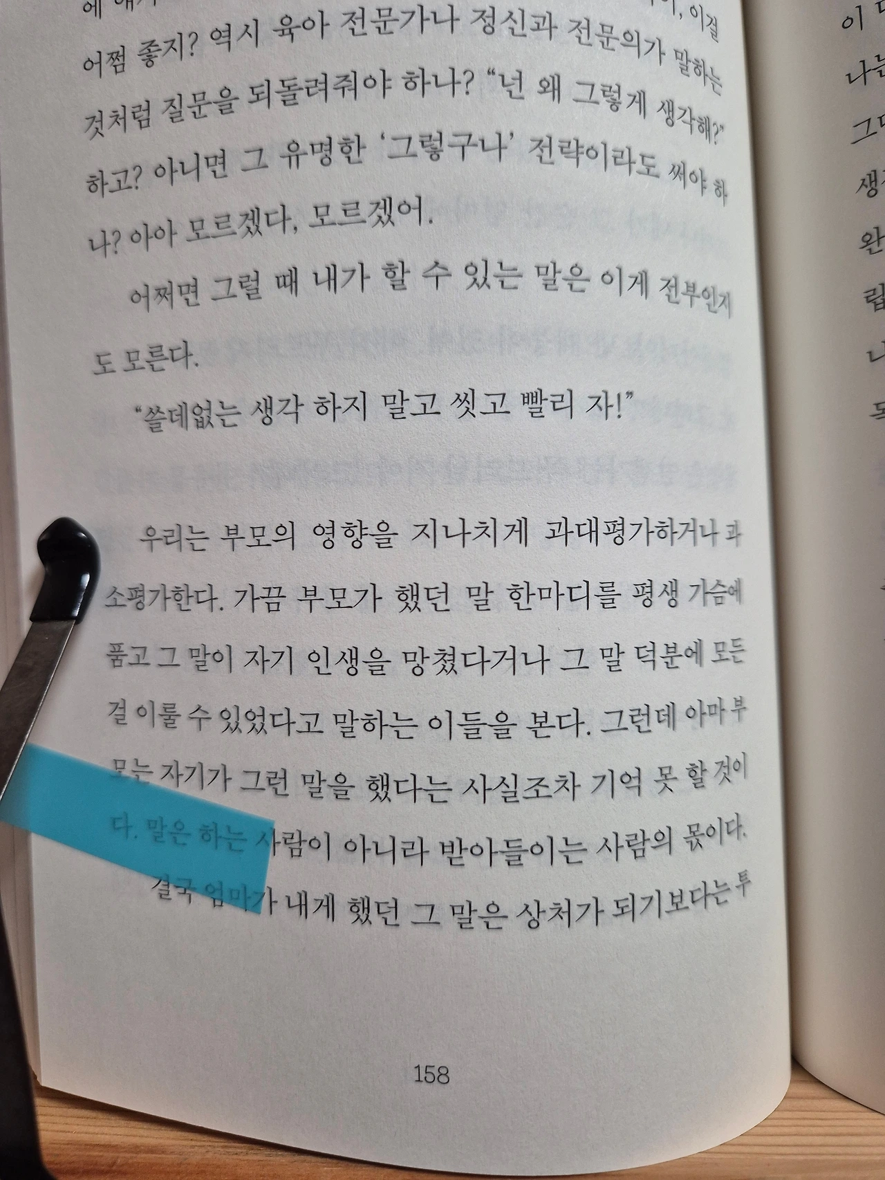 우리는 부모의 영향을 지나치게 과대평가하거나 과소평가한다. 가끔 부모가 했던 말 한마디를 평생 가슴에 품고 그 말이 자기 인생을 망쳤다거나 그 말 덕분에 모든걸 이룰 수 있었다고 말하는 이들을 본다. 그런데 아마 부모는 자기가 그런 말을 했다는 사실조차 기억 못 할 것이다. 말은 하는 사람이 아니라 받아들이는 사람의 몫이다.