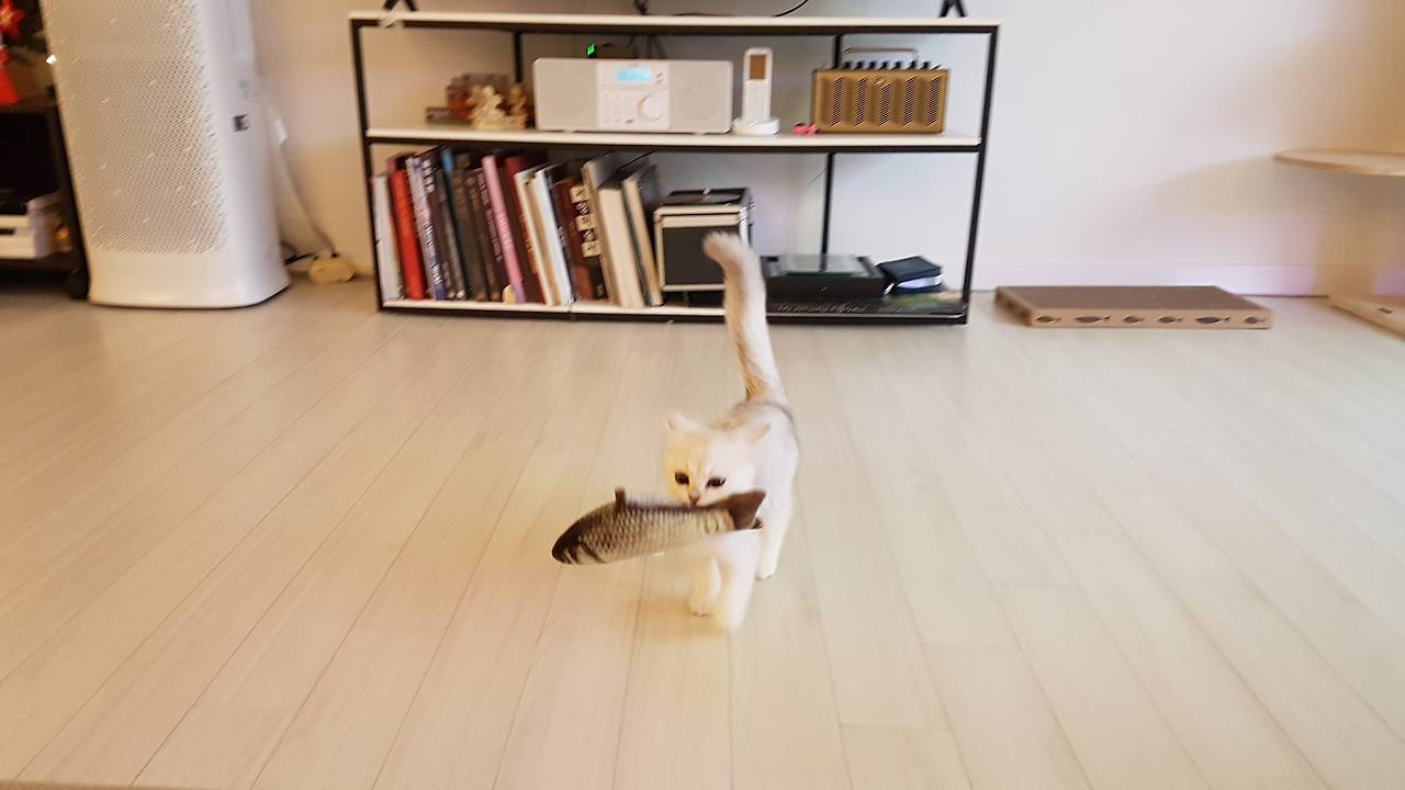 퇴근을 해서 집에 왔을 때, 비로소 사료를 먹었다는 얘기를 들었다. 그리고 집안 여기저기를 탐색하기 시작했으며, 아이들과 사냥놀이도 같이 했다 한다.