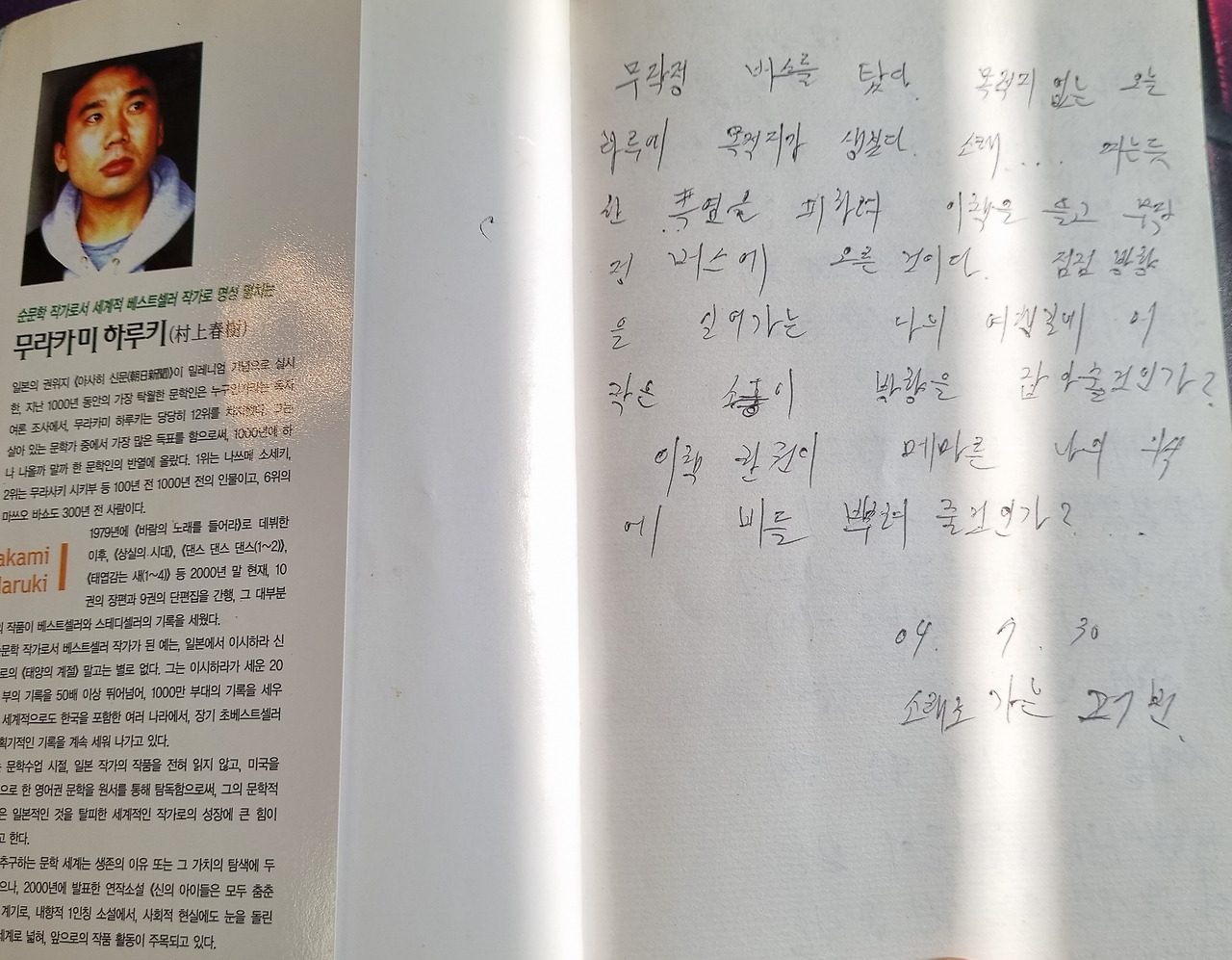 대학시절 푹 빠져 봤던 무라카미 하루키의 노르웨이 숲. 책 표지 뒤 낙서도 참, ... 젊은 날에 초상답게 겉멋만 잔뜩 끄적여 놨습니다.(현시점의 저는 이불킥을 하고 있습니다)