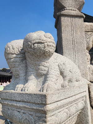자, 이제 우리는 월대로 올라가 보겠습니다. 근정전 앞 2층으로 쌓은 기단이 바로 월대인데요. 올라가면서 보면 앞에서 설명드렸던 답도도 보이고요, 또 신기하게 여러 동물들의 조각도 보입니다. 경복궁의 정전이 다른 궁궐과 가장 다른 점이 바로 이 동물상들입니다. 근정전만의 시그니쳐라고나 할까요?