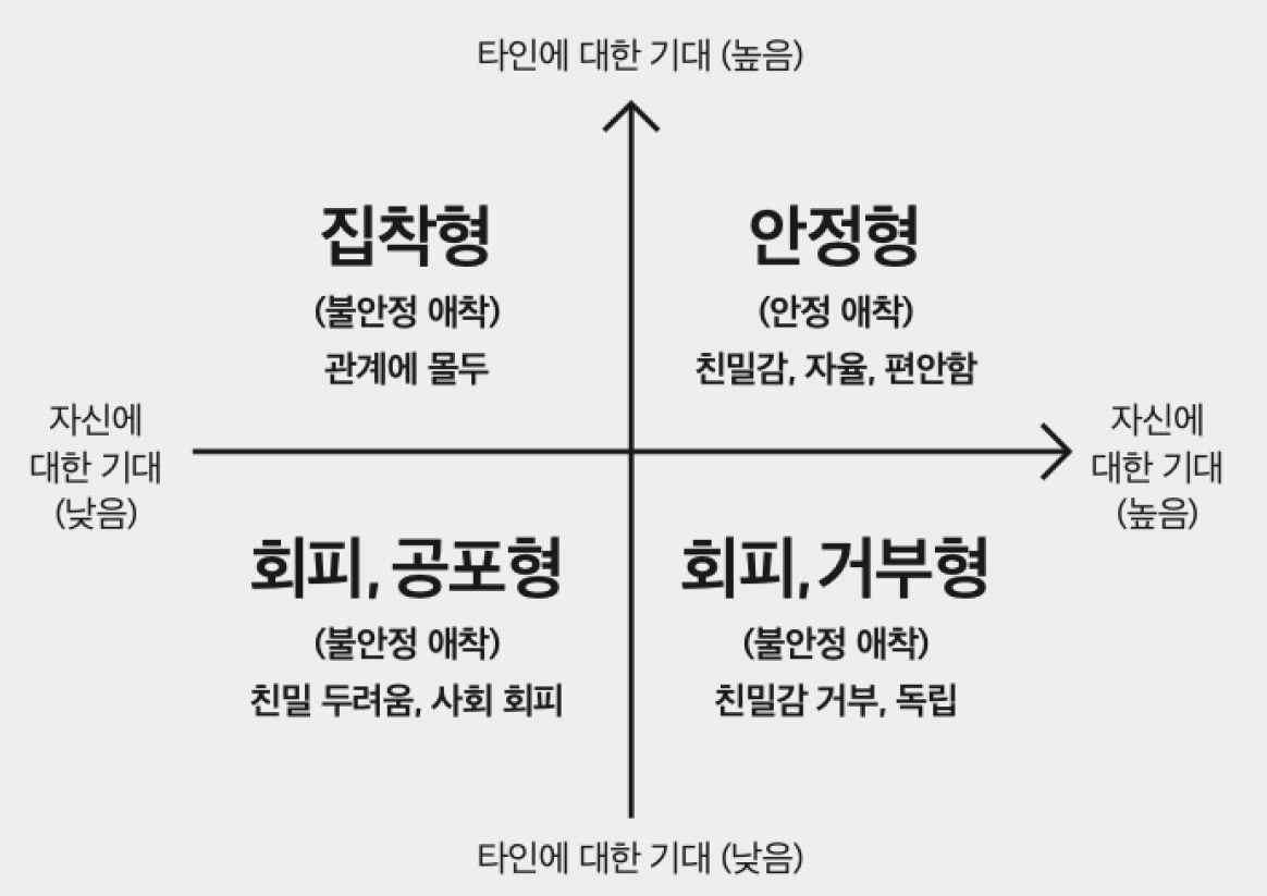 이후 연애 관련 연구에서는 애착 유형이 관계의 많은 면에 영향을 미친다는 것이 수천 건의 연구를 통해 입증되었어요. 애착 유형은 안정형, 불안형, 회피형 그리고 혼란형으로 나뉩니다.