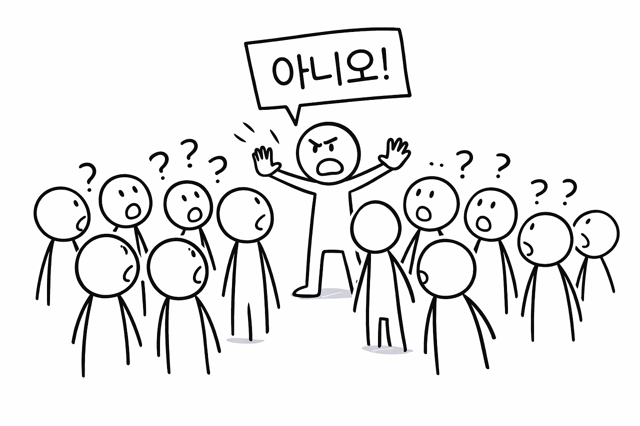예를 들어 우리는 의견을 내기 어려운 질문에 쉽게 주눅 들고는 한다. 출제자의 의도가 보이는 물음에는 그저 답은 '예'라는 답만 존재한다. 모두가 아니라 는 답을 하고 싶어도 그 답을 하기는 어렵다. 하지만 그들 중 단 한 명이 만약 '아니요'라는 답을 한다면 그 건 엄청난 파장과, 결과 또는 대단한 용기가 모두 에 게 심어질 수 있다. 그 단 한 명의 '아니요'라는 답에 그 옆에 있던 다른 한 명은 예와 반대되는 대답에 용기를 얻어 '아니요'라는 말을 한다면 옆의 사람의 옆에 있는 사람과 그 주변 사람들의 영향을 받아 가며 끝내 모두가 "아니요"라고 한마음을 담아, 출제자의 의도가 보이는 질문에도 우리는 그 의도를 빗나 갈 수도 있다.