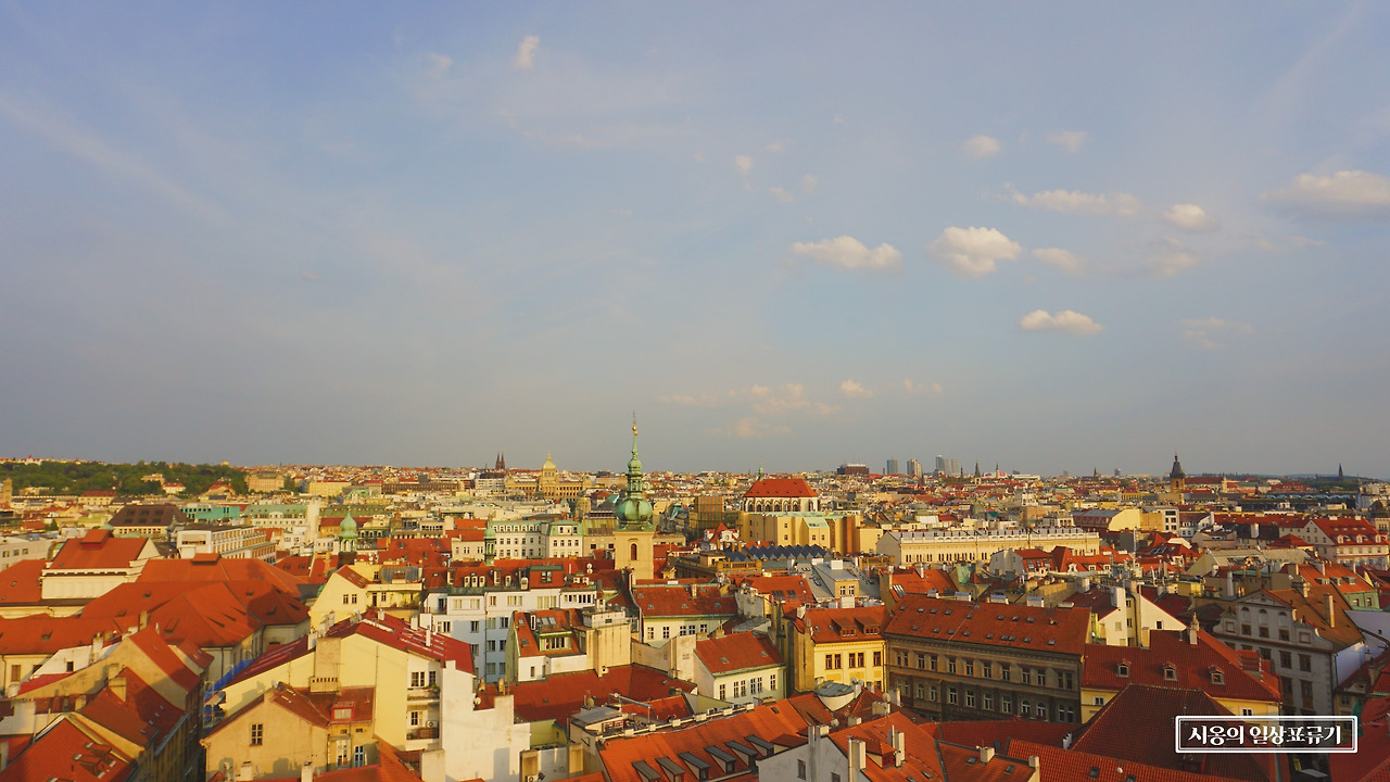 배가 든든해서인지, 시계탑 전망대에서 내려다본 프라하와 틴 성당이 너무 아름다워서인지, 마음이 다시 몽글몽글해지는 것을 느꼈다. 지평선까지 쭉 뻗은 빨간 지붕들이 늦은 오후의 햇살에 진하게 물들어있었다. '이것이 유럽이다!'라고 외치고 있었다. 어느 방향을 바라보든 산맥들이 보이는 한국과는 참 다른 풍경이다.