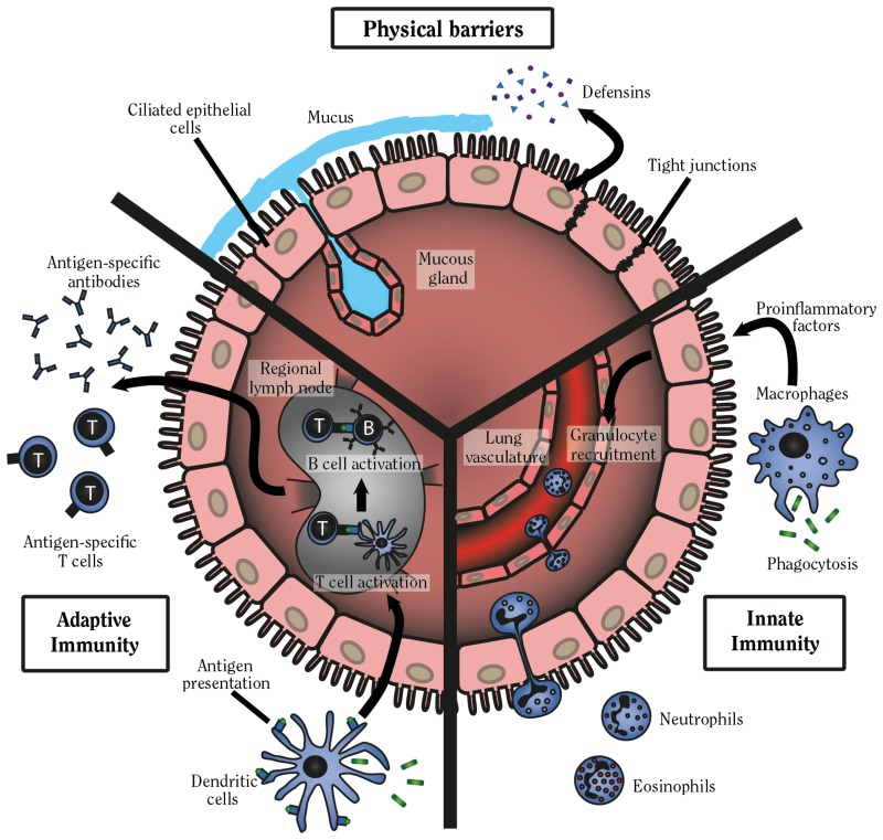 * 심화 설명 선천 면역은 미생물의 공통된 분자 패턴을 인식하는 패턴인식수용체(PRR)들을 통해 광범위한 병원체를 식별합니다. 이에 반해 적응 면역의 림프구(T, B세포)는 각기 무작위로 재배열된 항원수용체(TCR, BCR)를 지니고 있어 특정 항원에 선택적으로 결합합니다. 즉, 적응 면역세포는 미리 준비된 다양한 수용체 풀 중에서 침입한 항원에 맞는 세포가 선택되어 증식함으로써 작동합니다. 이러한 과정 덕분에 적응 면역은 특이성과 면역 기억을 갖지만, 처음 반응에 다소 시간이 필요한 것입니다.
