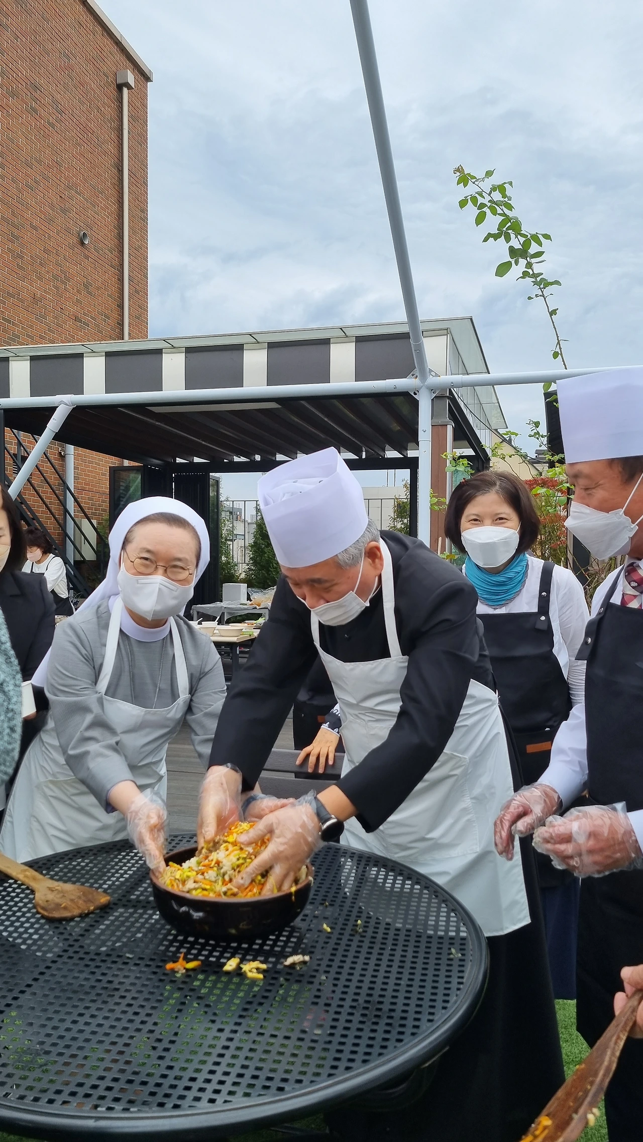 1층 만남의 방과 2층 소강당, 6층 옥상에서 전신자 비빔밥 점심 파티가 열렸다. 사십여 명의 남녀 봉사자들이 이틀 동안 희생적으로 준비해 온 헌신 덕분에 정성스럽게 준비한 점심 대접이 척척 순조롭게 이루어졌다. 혼자서 20포기의 배추김치를 담아 기증한 자매님도 있었다.