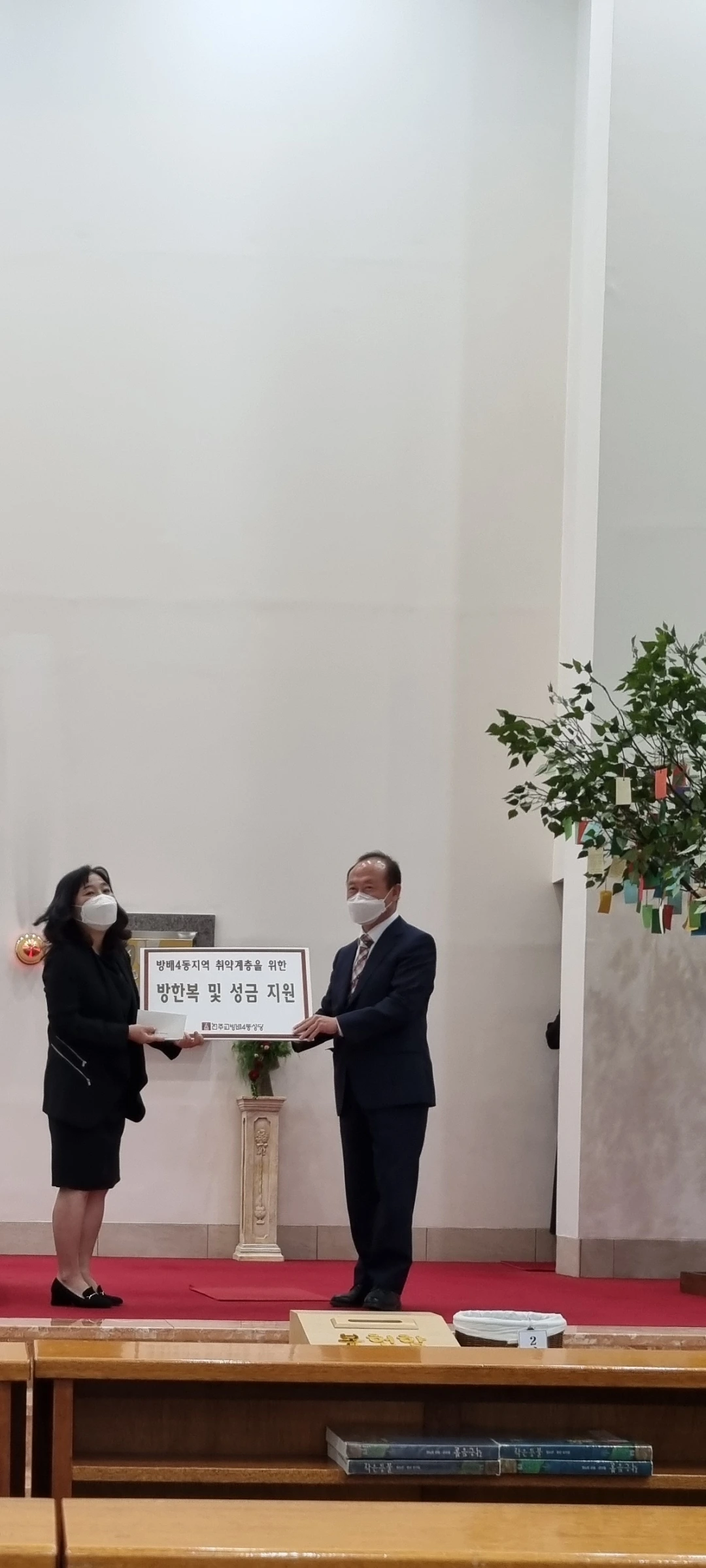 전례 후, 신부님의 사회로 사목회장님과 지역센터장이신 동장님이 강단에 올라오셨다. 지역사회 취약계층을 위한 방한복 한 트럭과 성금을 전달하는 것으로 미사가 끝났다.