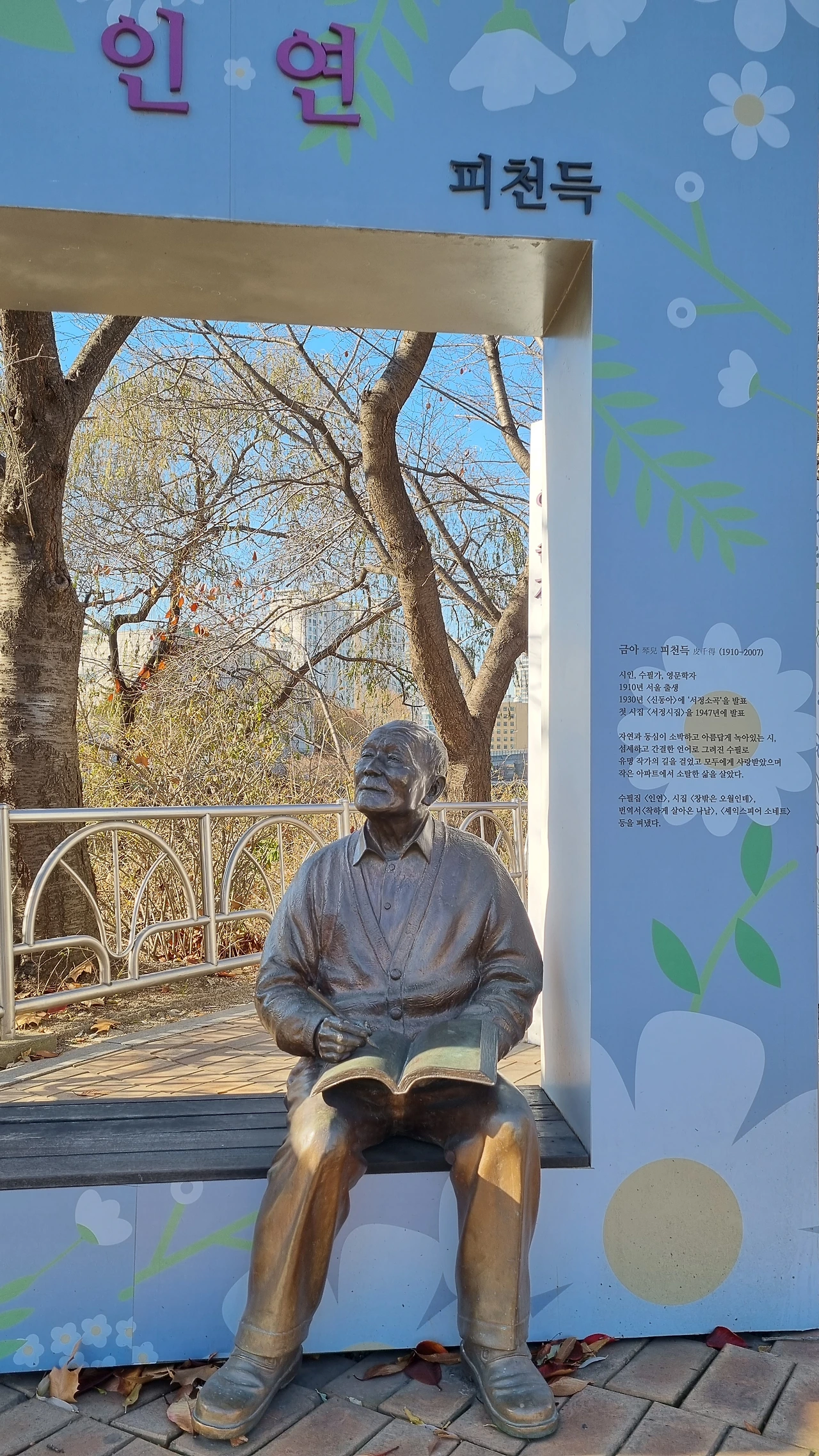 곳곳에 선생님의 작품이 새겨진 비석이나 하얀 돌의자들이 놓여 있다. 무릎 위에 공책을 펼쳐 두고 손에는 연필을 쥔 채 생각에 잠긴 얼굴로 먼 하늘을 바라보며 나무 벤치 위에 앉아 계시는 선생님의 동상도 있다. 지나다닐 때마다 절로 시선이 가 닿는다.어떤 날은 누군가 마스크를 씌워 놓기도 한다.