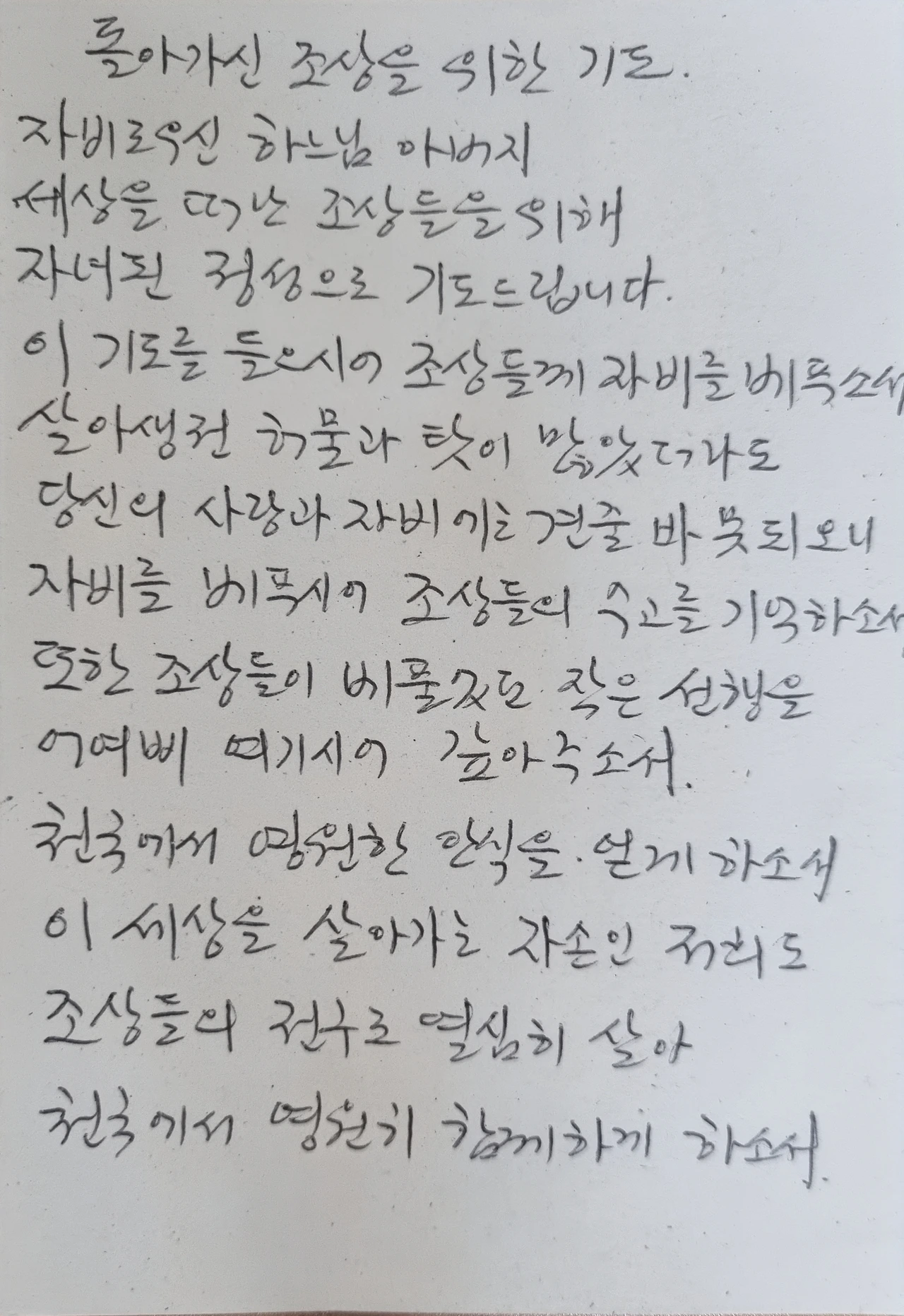 반반으로 인원을 갈라 내가 속한 쪽이 계송 선창을 하고 또 남은 반이 응송을 했다. 마무리로 중ㆍ고생인 두 외손녀가 돌아가신 조상을 위한 기도문을 읽었다.