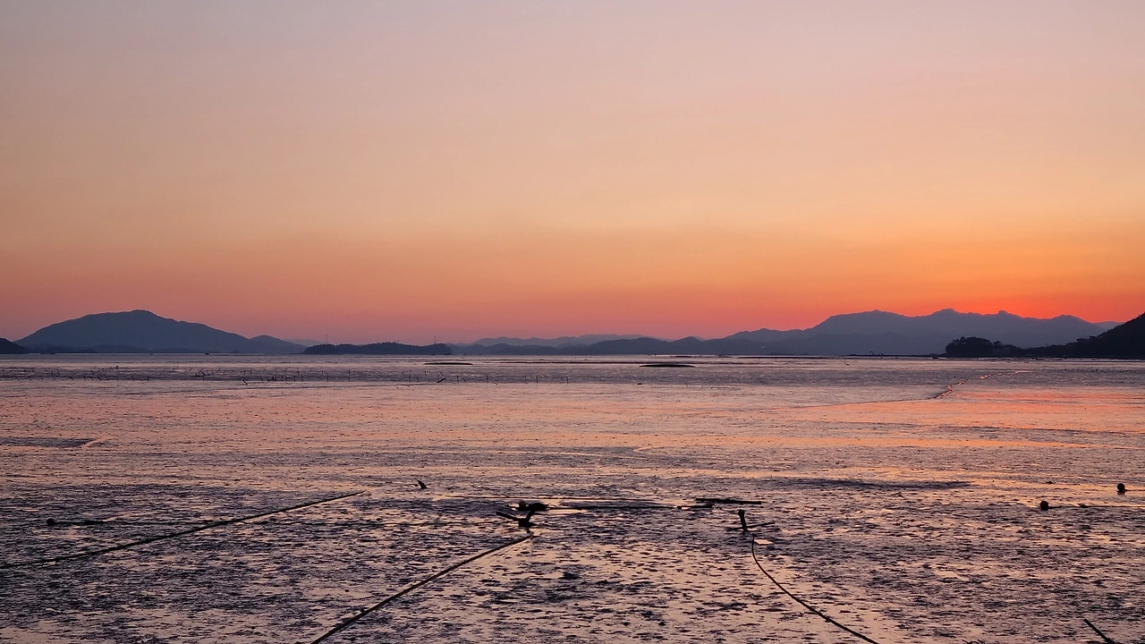 6시 20분, 와온해변에 도착했을 때 이미 해는 수평선 아래로 가라앉았습니다. 바다 물결과 얼굴 맞대고 있는 하늘이 사이좋게 빨강도 아닌 분홍으로 엷게 물들었습니다. 쉽게 사라질 것이기에 더 아름다운지도 모릅니다. 다급하게 셔터들을 눌러댔습니다. 삼각대에다 촬영 카메라까지 준비해 온 분들도 마음과 동작이 모두 급해져 우왕좌왕 자리들을 옮겼습니다. 10분도 채 지나지 않아 노을도 점점 어둠 속에 잠기고 이제는 숙소로 향했습니다.