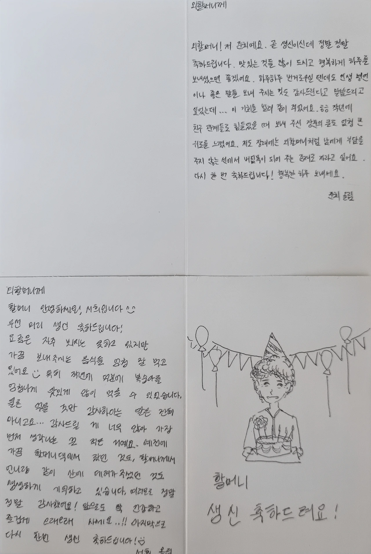 가족 중 누군가의 생일날이 되면 누구랄 것 없이 제일 먼저 알게 된 사람이 성인 여덟 명이 모여 있는 가족 카톡방으로 축하 메시지를 올린다. 주로 딸들이 그 일을 한다. 카톡방이 바빠진다. 다 함께 축하 인사와 답글이 오고 간다. 개인들끼리 선물도 주고받는 모양이다. 나도 축하 송금을 한다. 형편이 되면 주말을 이용해 누군가의 집에서 다 같이 모이기도 한다. 부모인 우리 집에서 모일 때가 제일 많다.