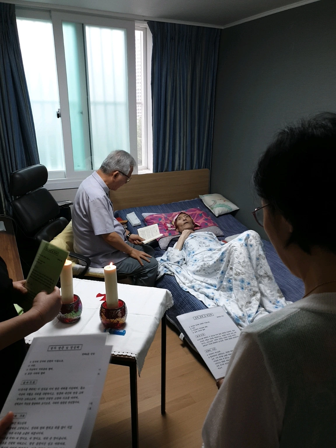 오후 2시 10분, 주임 신부님과 수녀님, 여성 총구역장과 16 구역장, 이웃 안나 씨가 집으로 오셨다. 신부님은 우리를 모두 나가 있게 한 다음 누워 있는 남편의 침대 옆 의자에서 고해성사를 주셨다. 잠시 후 닫았던 방문을 열고 수녀님의 도움을 받으며 신부님의 집전 하에 종부성사 의식을 봉헌했다.