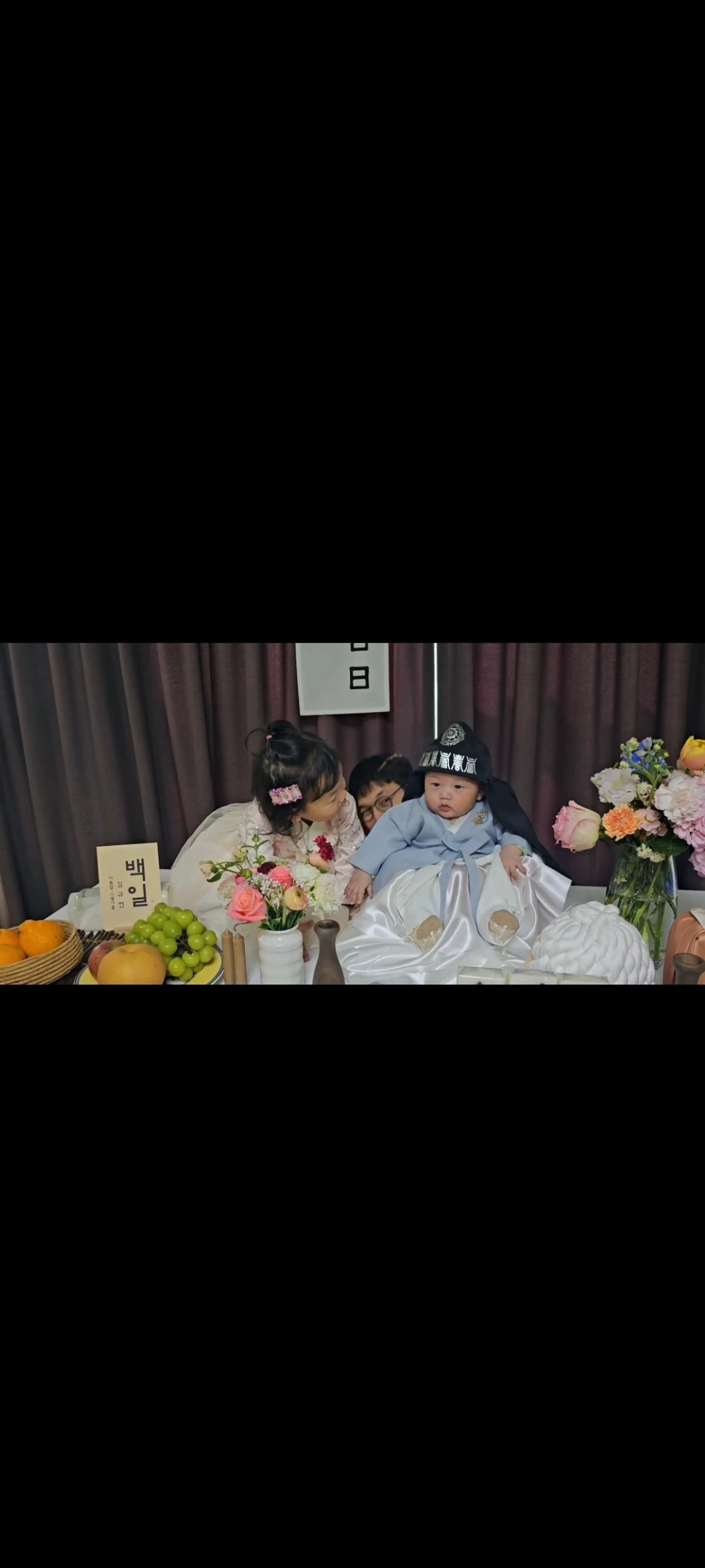 박스 안에서 나온 간단한 개량 한복을 입히고 두건까지 씌우니 여릿하던 갓난쟁이 손자가 한순간 의젓한 도령으로 변신한다. 이미 화려한 예복을 갖추어 입고 있던 2년 터울 누나와 둘이 이 잔치의 주인공이 되었다.