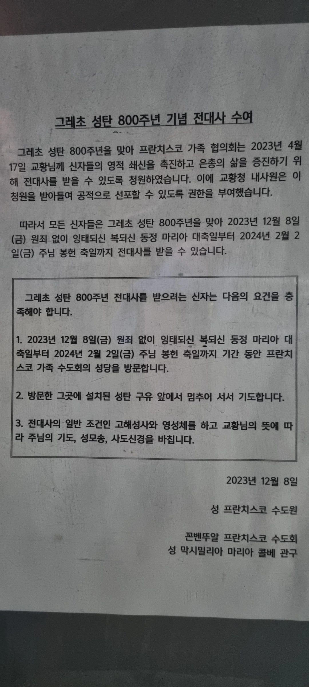 그레초 성당 성탄 800주년 기념 전대사 수여 뉴스다. 1223년 프란치스코 성인이 이탈리아 그레초에서 최초로 성탄 구유를 만드셨다고 한다.