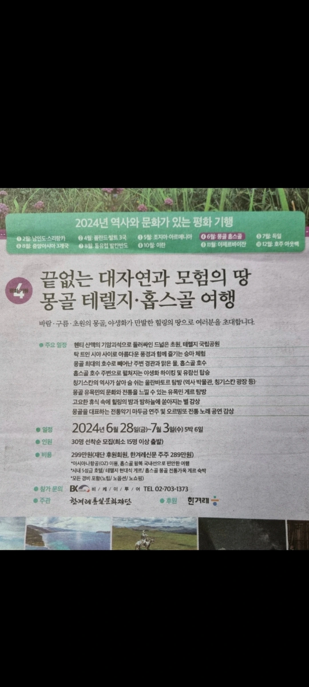 350만 인구의 절반이 모여 산다는 수도 울란바토르에서의 역사 탐방, 홉스골 호수에서의 물멍 별멍 숲멍, 테렐지 국립공원의 드넓은 초원 구릉 구석구석에 보석처럼 뿌려져 있는 야생화 감상. 칭기즈칸의 후예들이 이어가고 있는 전통문화 체험.