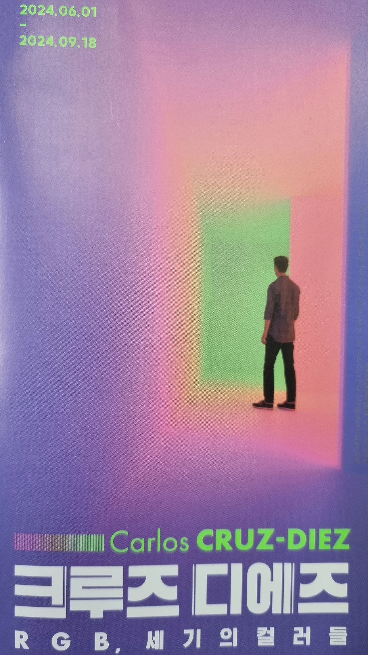 옵아트와 키네틱 아트의 개념과 범위를 확장시킨 색사상가, 과학자의 학문을 적용하는 예술가라는, 다소 낯설게 소개되는 크루즈 디에즈 (Cruz Diez, 1923~2019, 베네수엘라)의 작품은 도슨트의 전문적인 해설을 듣지 않고서는 그 진가를 결코 알 수 없었다. 빛의 삼원색인 빨강, 파랑, 초록, 세 가지 색만으로 출력해 낸 프린트물에서 움직임에 따라 변화하는 색의 조합을 보게 된다는 색의 간섭 효과와 인간의 눈이 작용하는 보색 잔광 기능으로 인해 일어나는 착시 현상에 대해 해박한 지식을 갖춘 도슨트가 자세히 설명해 주고 직접 체험하면서 느끼게 해 주었다.