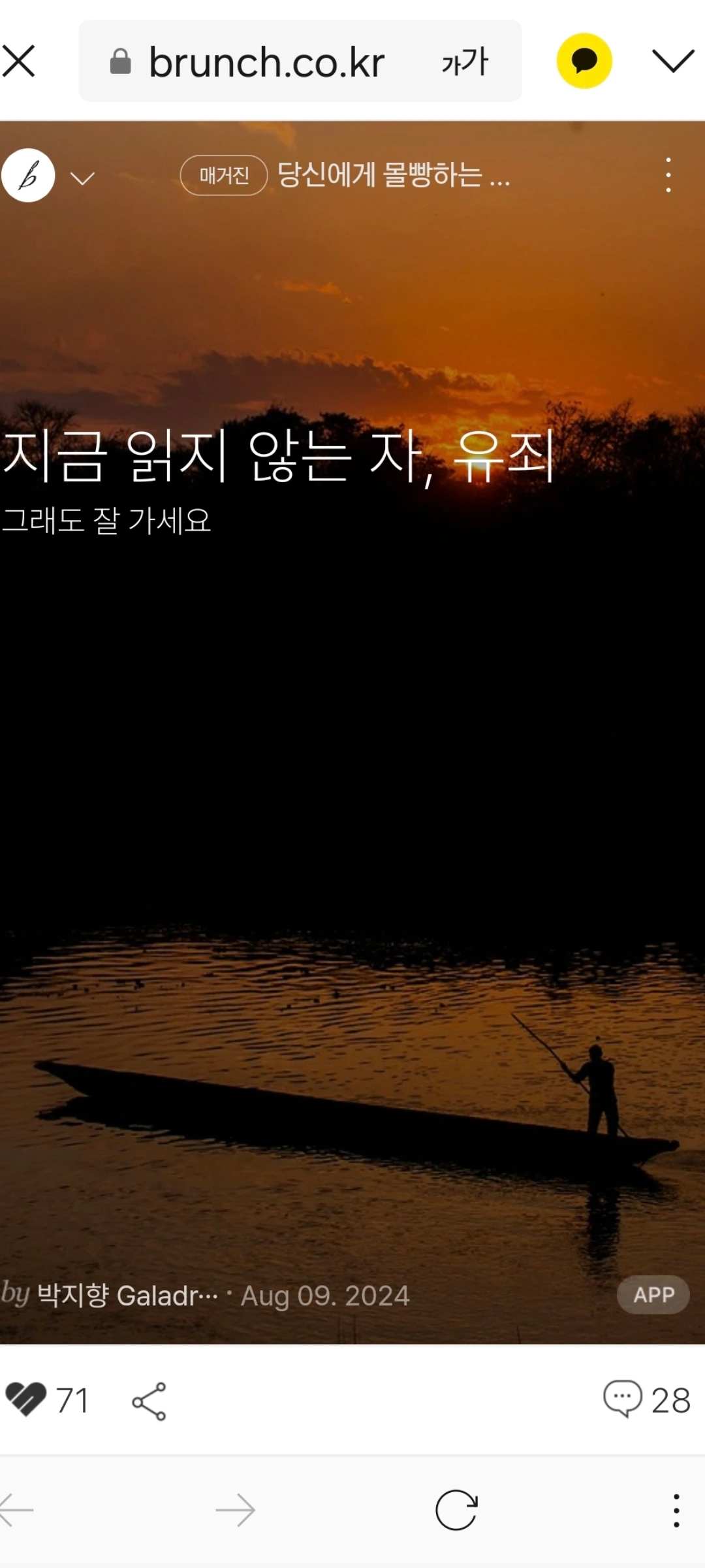 나는 이틀이나 지나서 다른 작가님의 추임새를 받고서야 그 글을 읽었다. 데리고 자던 손주의 칭얼거림에 따끈한 우유 한 병을 타서 먹이고 말똥하게 잠이 깬 일요일 새벽 네 시. 두 살 터울, 시샘 많은 누나는 꿈나라에서도 엄마 아빠를 독점하여 안방에서 잠들어 있고 할머니 몫이 된 순하고 착한 어린 손주도 다시 쌕쌕 평화로운 잠나라로 빠져들었다. 일주일에 하룻밤 머무는 결혼 7년 차 아들네 집. 어둠 속에서 가만히 읽은 길고 뜨거운 한 편의 브런치 글. 조금 울었다. 뜨겁고 조용한 눈물.