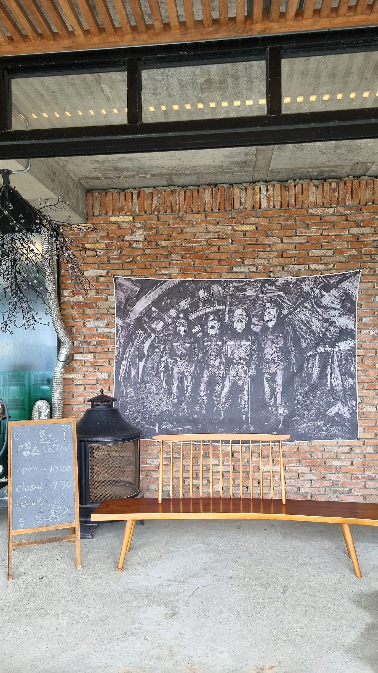다시 핸들을 잡더니 산속으로 향한다. 산 중턱에 나타난 낡은 시멘트 건물. 갱스 카페. 장군봉 아래 산중턱에 자리한 이곳은 탄광지역 광부들이 목욕탕으로 쓰던 건물을 카페로 꾸민 곳이다. 카페 뒤쪽은 폐광 동굴을 이용한 보령 풍욕장 동굴이 있다지만 꽤나 더운 날씨라 냉방이 잘 된 카페로 직행했다. 2층 전시 공간도 잠깐 둘러보았다. 인물 사진들을 직접 기념 촬영하여 판매하고 있었다.