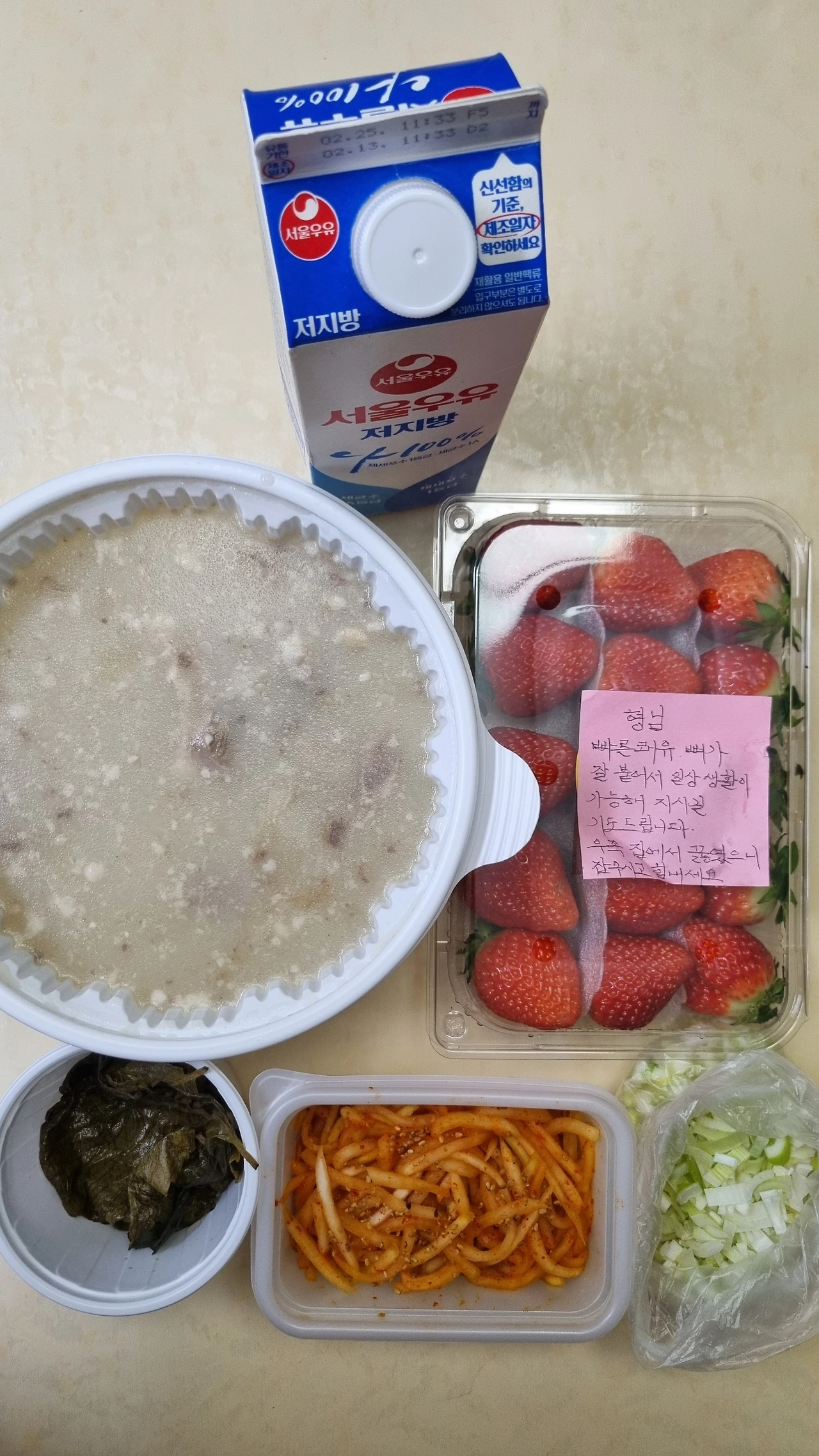 '형님, 빠른 쾌유로 뼈가 잘 붙어서 일상생활이 가능해지시길 기도드립니다. 우족탕, 집에서 끓였으니 잡수시고 힘내세요.'