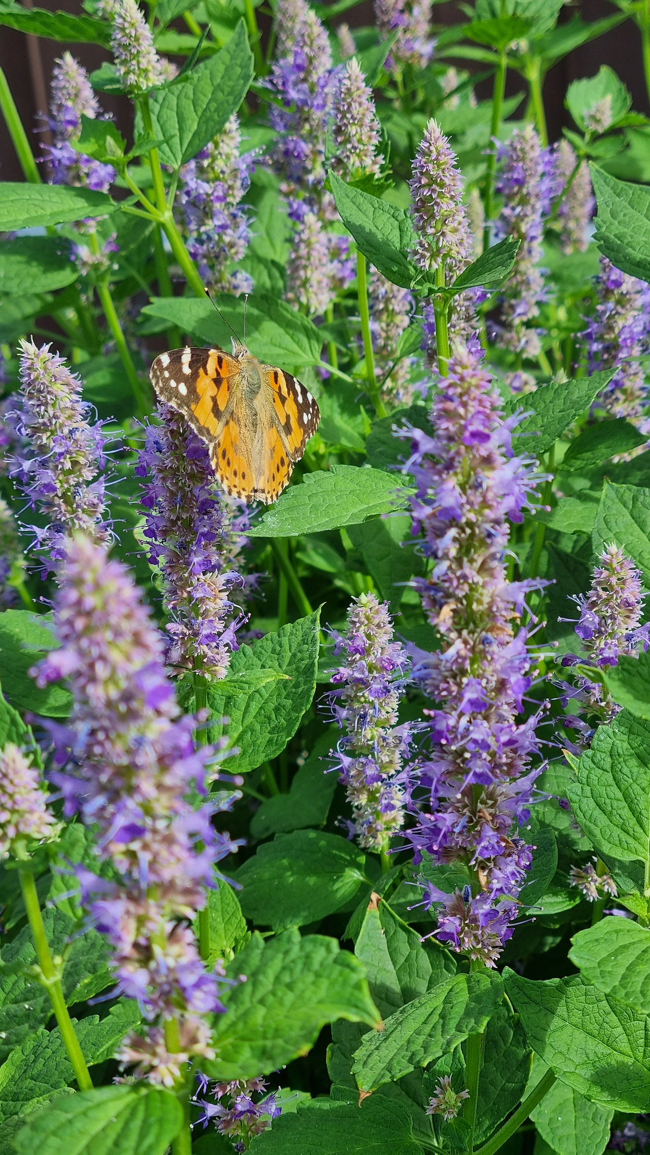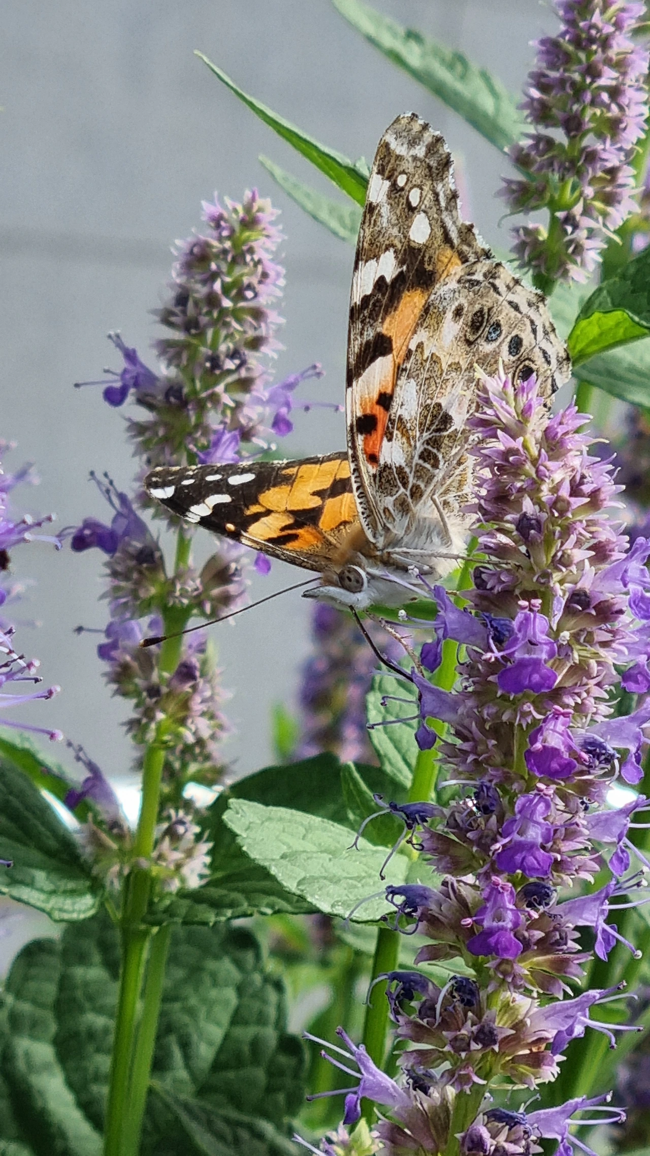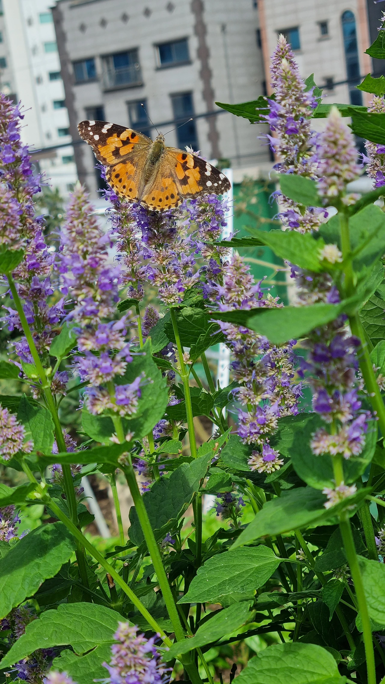 새벽 시간, 도시 한복판 옥상 텃밭에도 나비들이 날아온다. 한 마리 혹은 두 마리. 팔랑팔랑 나풀거리다 알 수 없는 어딘가로 또 금세 날아가 버리곤 한다. 오늘은 내가 머무는 내내 텃밭을 떠나지 않는다. 계속 내 마음을 잡아당기는 화려한 무늬의 독특한 나비 한 마리. 가지 끝마다 보라색 꽃을 가득 매단 방아의 은은한 허브향이 매혹적이었을까? 소담스런 꽃잎 아래 달콤한 꿀이 감미로웠을까? 핸드폰을 갖다 대고 사진을 찍는데도 꿈쩍하지 않는다. 장난스레 가까이 다가가 말을 건넸다.