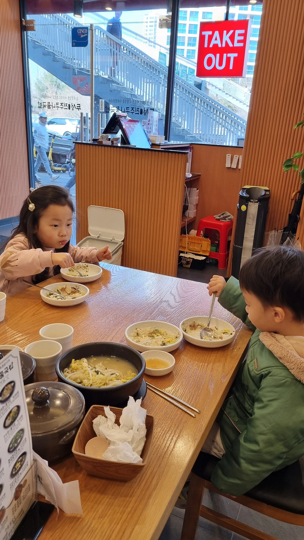 전주콩나물국밥집 앞이다. 마침 점심시간이 다 됐다. 두 녀석 손을 잡고 국밥집 문을 열었다. 직장인들이 없는 토요일인 때문일까, 널찍한 실내가 그리 붐비지 않는다.