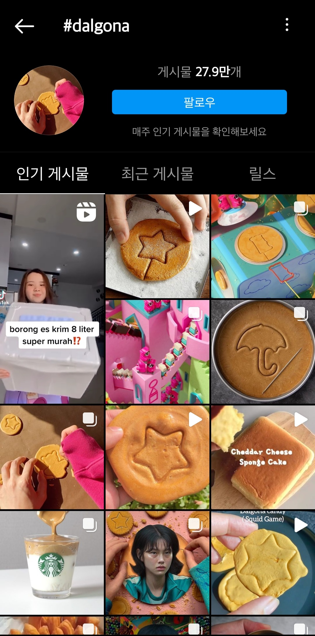 인스타그램 내 #dalgona 게시물은 약 28만 개에 이를 정도입니다. 해외 팬들은 SNS에 달고나 만들기 영상을 올리며 빠르게 후기를 공유하고 있어요.
