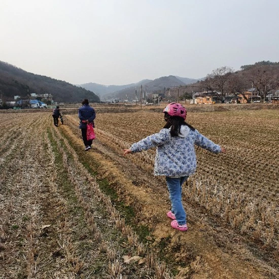 우리는 밖으로 나와 들판을 걸었다. 엄마는 겨울이라 비어있는 밭으로 성큼성큼 들어갔다. 나는 남에 밭에 들어가는 엄마를 말렸고, 농사 전이라 괜찮다고 엄마가 대답했다. 엄마는 칼을 한 손에 쥐고, 빨간색 비닐봉지를 들고, 뒷짐을 지고 걸었다. 아이들과 나도 엄마를 뒤따랐다. 아이들은 흙이 고르지 않은 밭둑을 걷다가 발이 미끄러지자 양손을 쭉 펴고 수평을 잡고 천천히 걸었다. 저 멀리서 엄마가 소리쳤다.