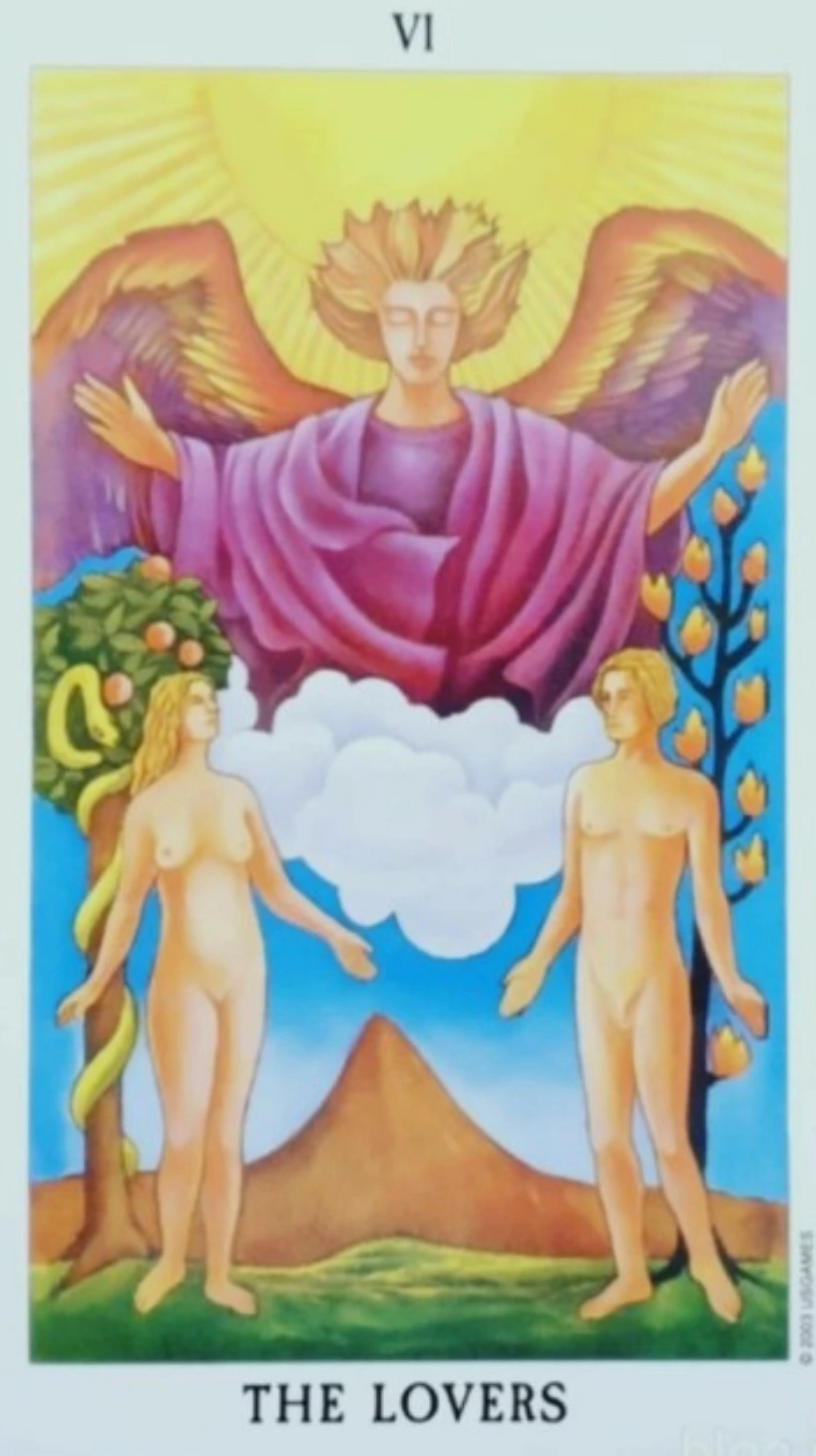 타로카드에 6번은 연인 카드이다. 여자와 남자가 등장한다. 둘은 발가벗고 있으면서 적당한 거리를 유지한 채 서 있다. 이주은 작가의 책 <그림에, 마음을 놓다>에서 사랑하는 사람도 가끔은 거리를 두고 서로를 낯설게 바라볼 필요가 있다고 말한다. 본능이 이성과 균형을 유지하기 위해서 말이다. 타로 6번의 연인도 거리 유지 중으로 보였다.