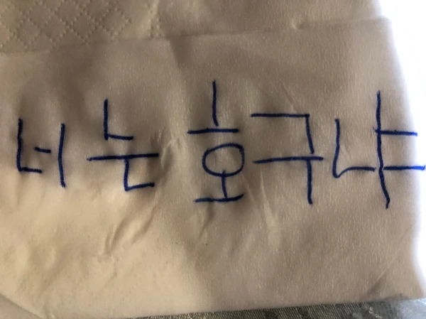 식당 종업원을 불러 펜과 종이를 달라고 했다. 종업원은 펜은 있지만 종이는 없다고 하여 어쩔 수 없이 식당 티슈에 글을 옮겨 적었다. 나는 티슈에 쓰인 글자를 말없이 쳐다보았다.