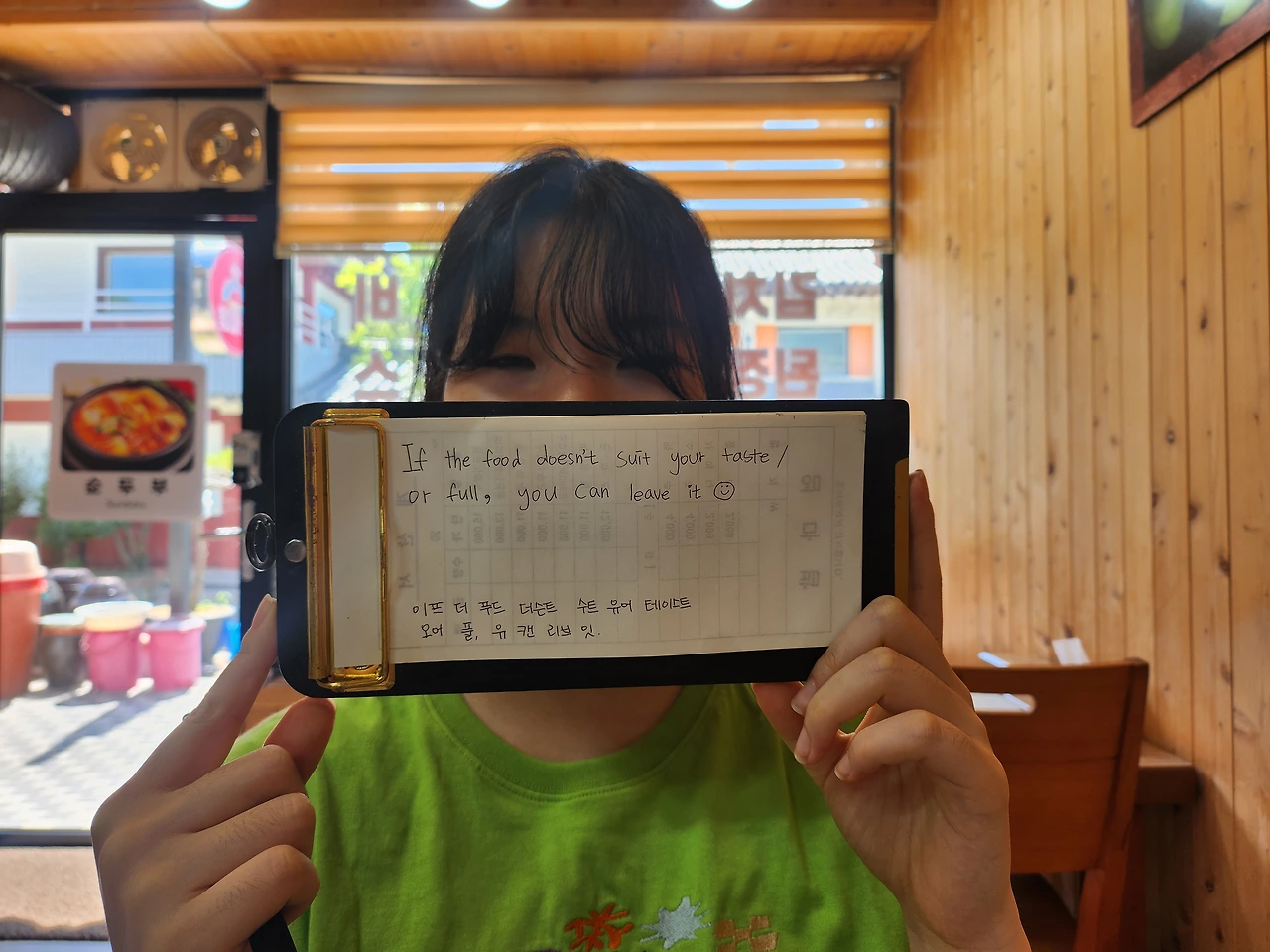 손님은 우리뿐이어서 여사장님과 자연스레 대화가 이어졌는데, 큰 식당이 독과점하는 그곳의 상권 특성에 대해 설명하시면서도 별 불만은 없으셨다. 혼자 감당할 수 있을 만큼의 손님이면 되고, 여러 번 찾아주는 단골손님들로 보람도 있다고 하신다. 다만 외국 관광객들이 짜고 낯선 음식을 앞에 두고 1,2시간이나 앉아 천천히 억지로 먹는 듯한 모습이 안쓰럽다며 그만 먹어도 된다고 말해주고 싶은데 말이 안 통하니 답답하다고 하셨다. 딸에게 영작을 해보라고 했다. 번역기의 검증을 거쳐 영수증 뒷장에 써 드렸다.