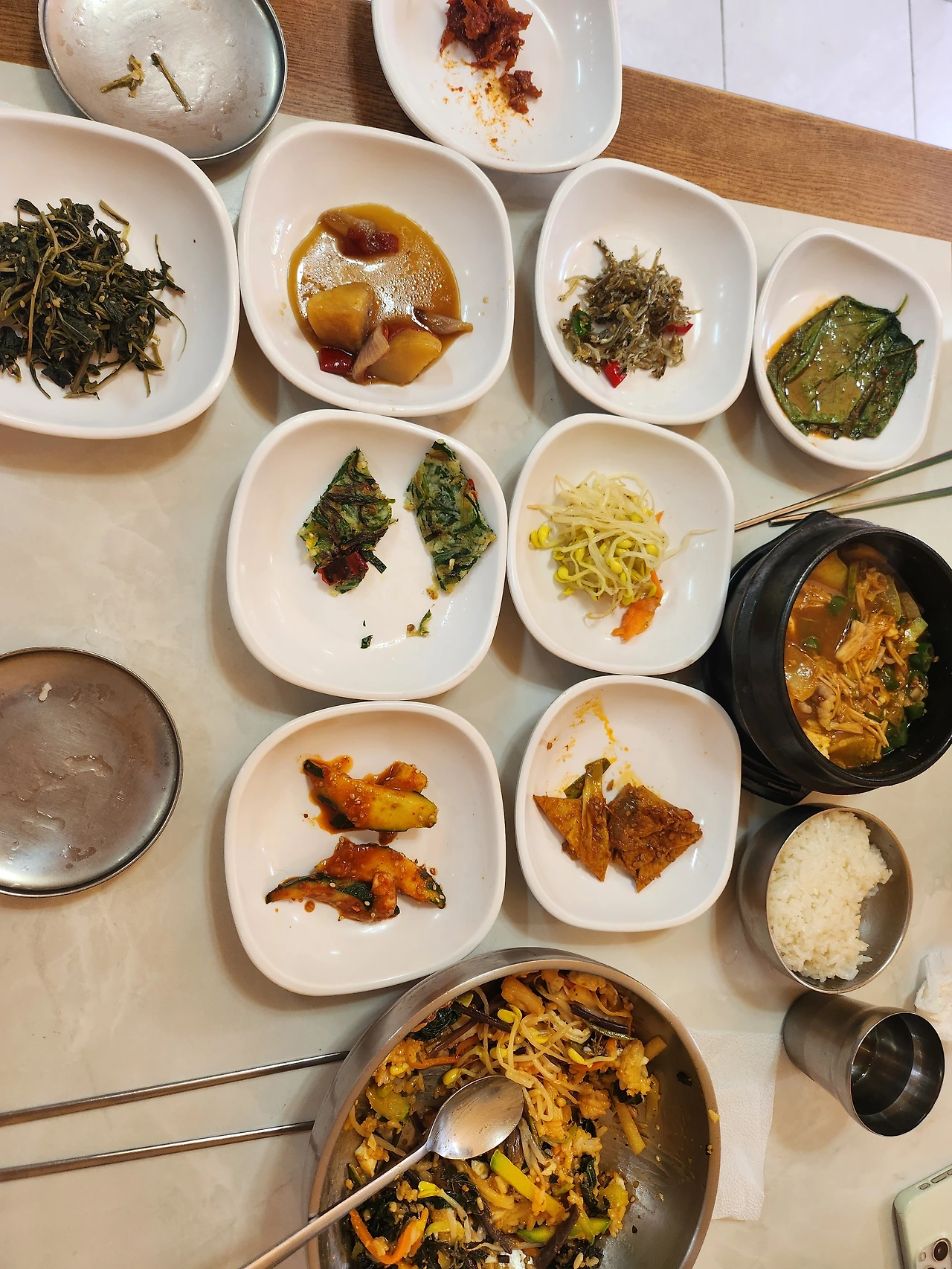 그의 외침은 뜨거운 햇볕 아래 흩뿌려진 물처럼 그 누구의 주목도 끌지 못하고 말라버리는 것 같았다. 우리마저 외면하기 힘들어서 그 가게로 갔다. 식탁이 4,5개 정도 있는 작은 가게인데, 정말 직접 재배하고 조리한 밑반찬이 줄줄이 나왔다. 묵나물과 부추전, 오이무침 등 평범하지만 기본에 충실한 맛깔스러운 반찬들이었는데, 특히 서울 사람들은 잘 모르는 콩잎장아찌가 매력적이었다.